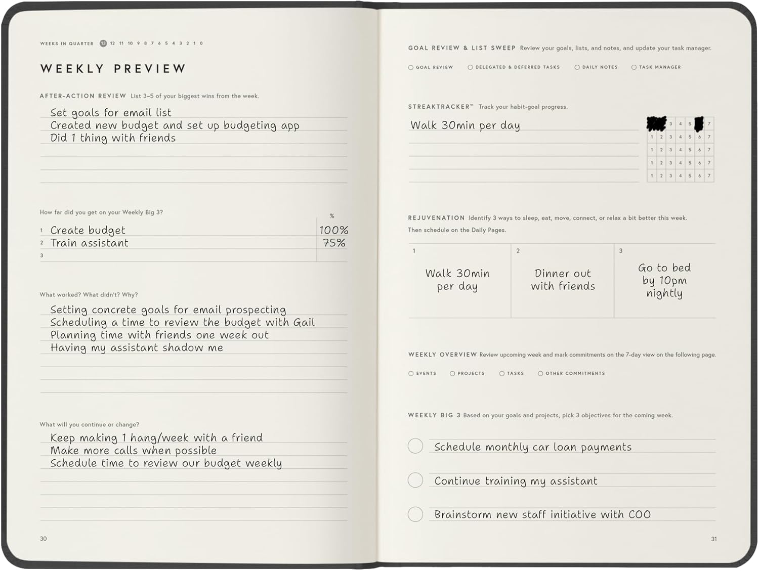 - 📈 TRACK YOUR PROGRESS & STAY FOCUSED – Utilize the weekly and quarterly review templates, alongside daily task lists, to seamlessly bridge the gap between your everyday actions and your long-term ambitions. With your priorities consistently in sight, you won’t be derailed by life’s daily demands. The Full Focus Planner empowers you to filter through the noise of the urgent and focus on what truly matters, ensuring steady progress toward your most important goals.