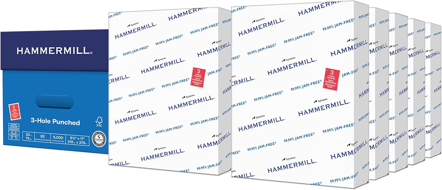 Hammermill Printer Paper, 20 lb Copy Paper, 3 Hole - 10 Ream (5,000 Sheets) - 92 Bright, Made in the USA, 105031C