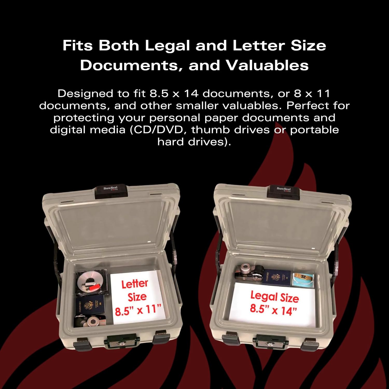 - Protects CDs/DVDs, flash drives, portable hard drives, birth certificates, passports and other valuable items from fire and water damage.