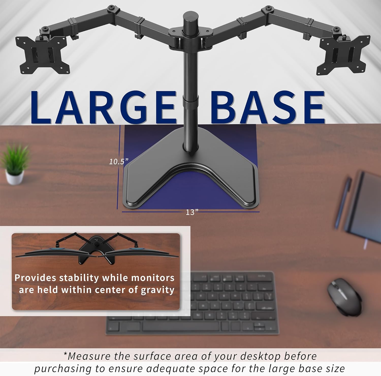 - Heavy Duty Extra Large Base: Measures 13" x 10.5" providing solid stability while monitors are held within its center of gravity. The bottom of the base features padding to protect your desk from scratches