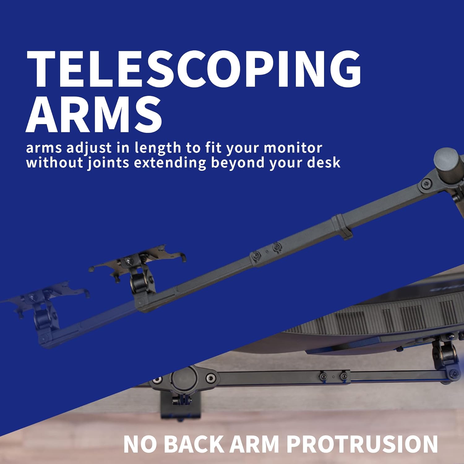 - Premium Telescoping Arms: Heavy-duty telescoping arms adjust in length to fit the size of your monitors. The arms slide into each other for added strength and stability