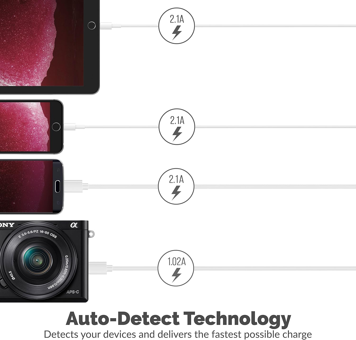 - Smart port technology maximizes compatibility with Android, Apple and other devices by enabling charging speeds of up to 12 amps among 6 ports or 2.4 amps per port.