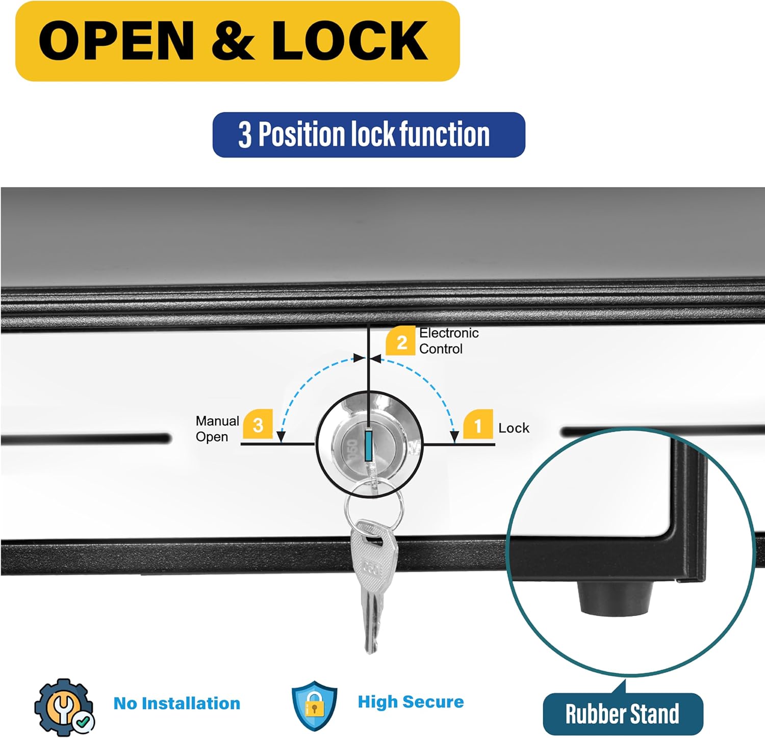 - 💻POS, ECR interface and 3-Position Lock: Seamlessly integrate with your Point of Sale (POS) System and Electronic Cash Register (ECR) via RJ11 cable for seamless connectivity, enhancing transaction speed, accuracy, and customer satisfaction. Ensure the highest level of security with a versatile 3-position lock mechanism allowing 1-Lock, 2-Auto Open by Printer/POS, 3-Manual open and a spacious front media slot.