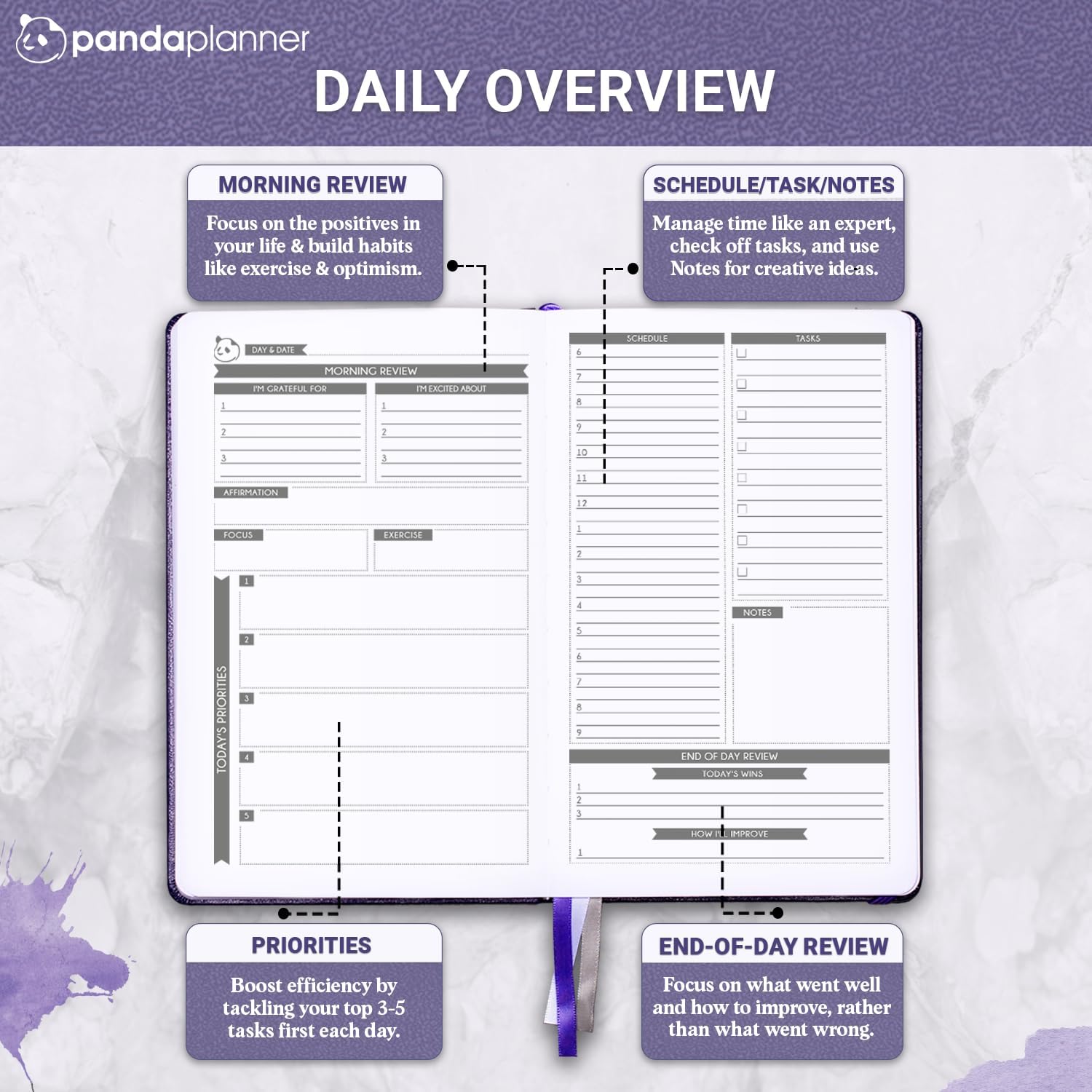 - Plan With Purpose, Stay on Track From busy mornings to packed evenings, this Panda Planner helps you organize your day with clarity. Use it to manage your time, set intentions, and reduce stress—perfect for professionals, students, and anyone balancing multiple responsibilities.