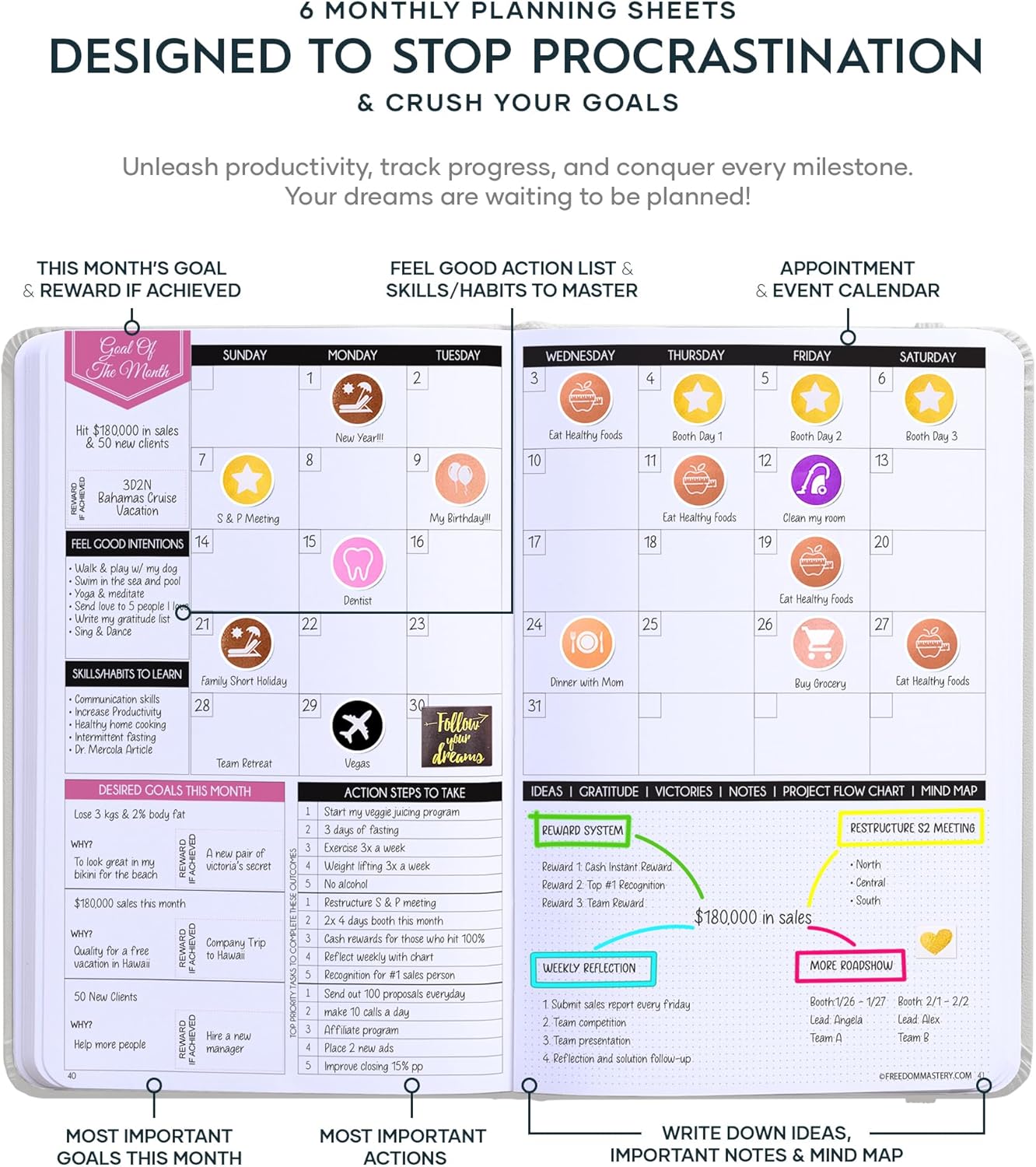 - GRATITUDE JOURNAL - This deluxe daily planner and gratitude journal comes in A5 size (5.8 x 8.3 inches). The life planner comprises 264 pages of thick 100 gsm paper, including 90 daily planning sheets, guiding you on how to become the best possible version of yourself on a mental, physical, and interpersonal level. It's a unique diary based on leading scientific studies proven to increase productivity and happiness. The journal features an out-foldable vision board to help you stay focused, morning and evening power questions, mind maps, reflection pages, habit trackers, a back pocket, and much more than any other planner on the market!