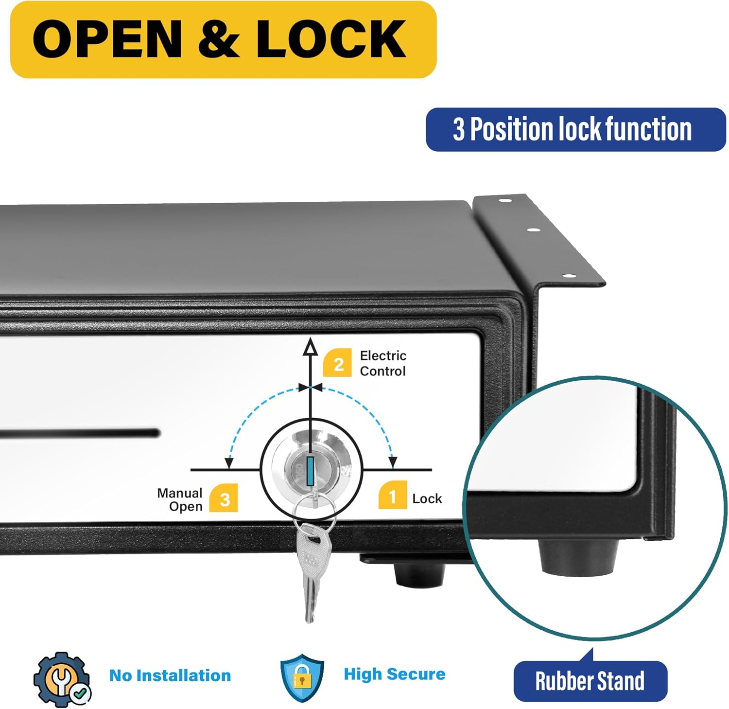 - 💳3-Position Lock& Single Large Front Media Slot: This cash drawer ensures the highest level of security with a 3-position lock mechanism: 1-Lock, 2-Auto Open by Printer/POS, 3-Manual open