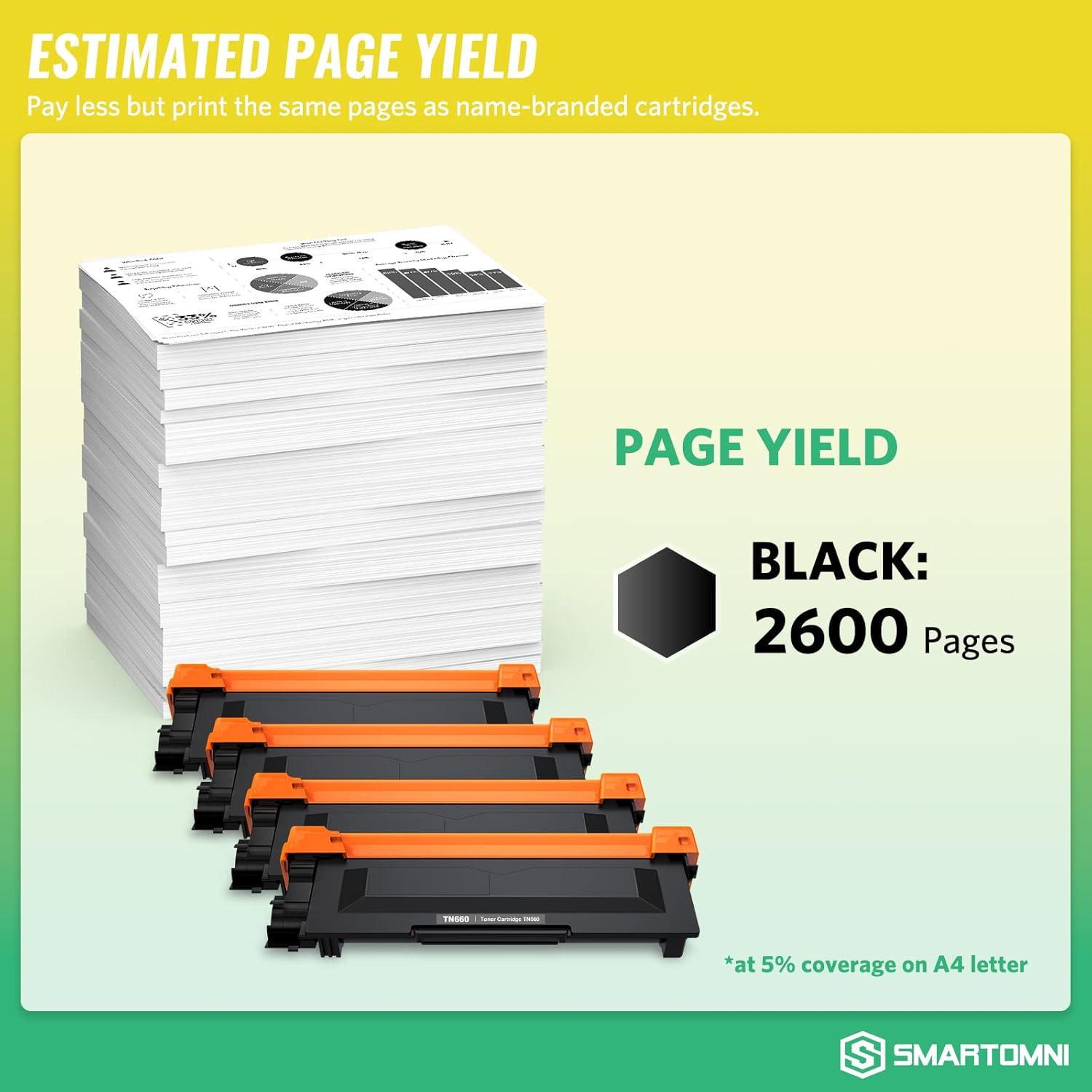 - Estimated Page Yield: Per TN660 toner can print 2600 pages at 5% coverage of letter/A4 as usual.