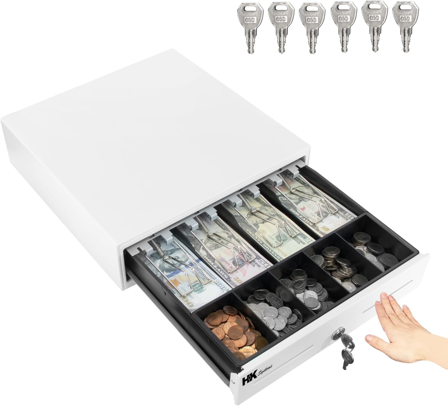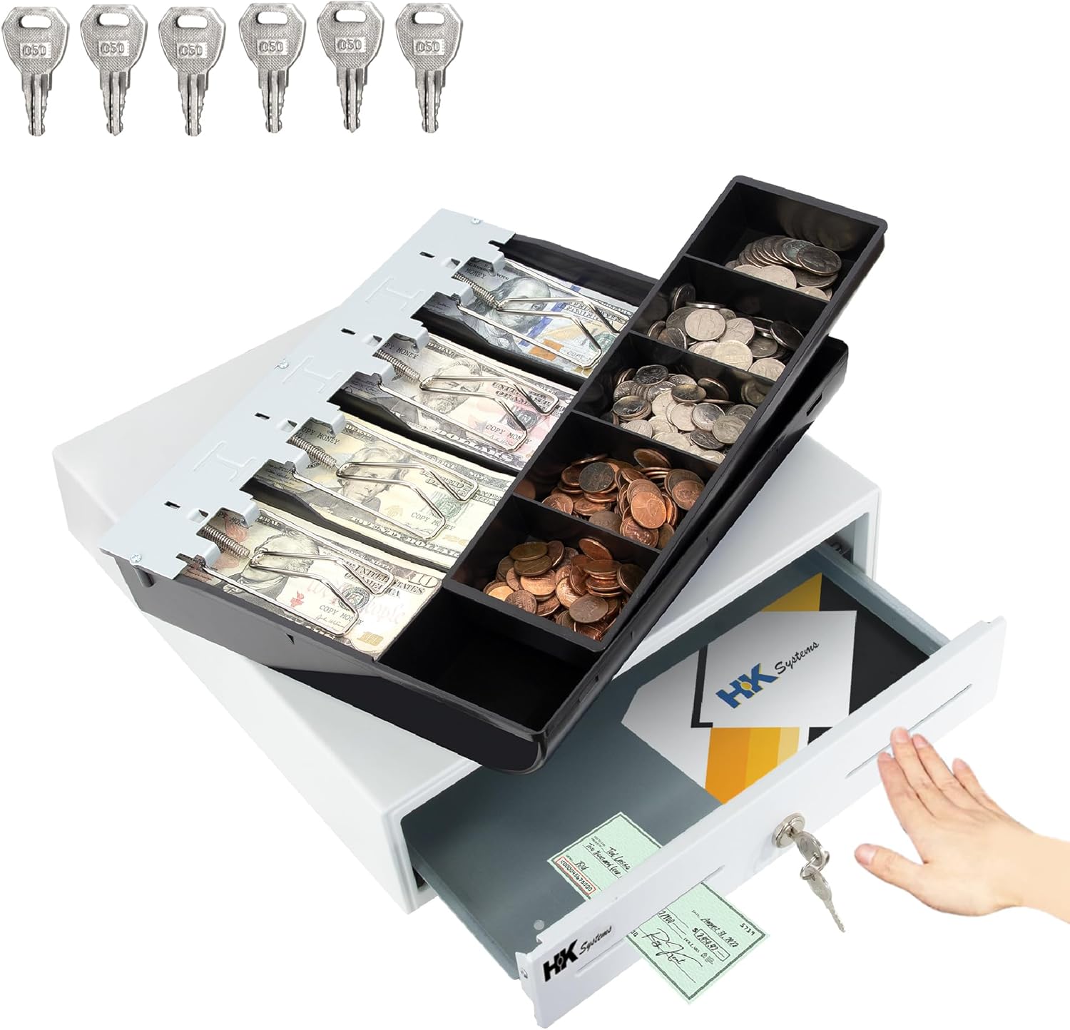 HK SYSTEMS 13inch Heavy Duty Manual Push-Open Cash Drawer with 4Bill/5Coin, Removable Till, Two Medial Slots, White