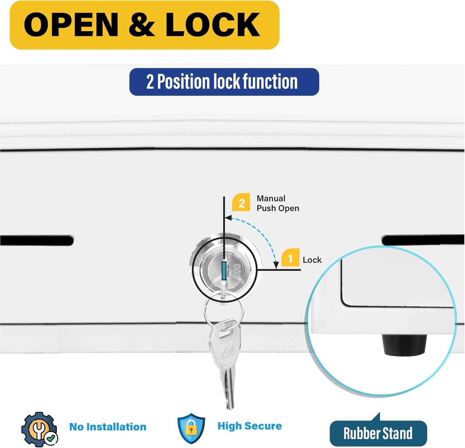 - 💰Movable Till & Dual Media Slots: Customize your cash management effortlessly with our Adjustable Till, providing the flexibility to adapt to your business needs. Safely store Bills, Receipts, or Checks beneath the till for added security and organization.