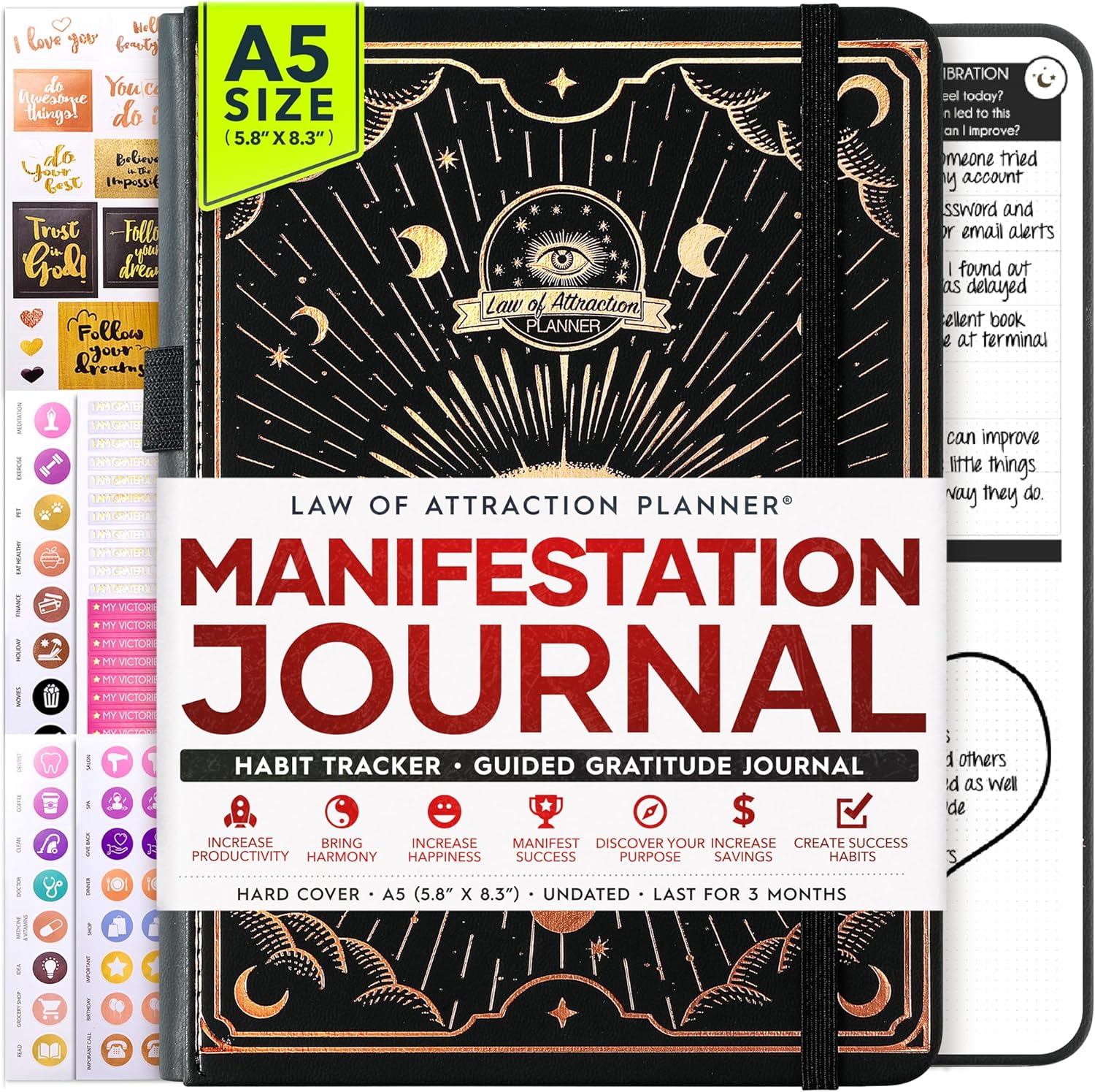 - MANIFESTATION JOURNAL - This deluxe daily planner and self-care journal comes in A5 size (5.8 x 8.3 inches). The life planner comprises 264 pages of thick 100 gsm paper, including 90 daily planning sheets, guiding you on how to become the best possible version of yourself on a mental, physical, and interpersonal level. It's a unique diary based on leading scientific studies proven to increase productivity and happiness. The journal features an out-foldable vision board to help you stay focused, morning and evening power questions, mind maps, reflection pages, habit trackers, a back pocket, and much more than any other planner on the market!