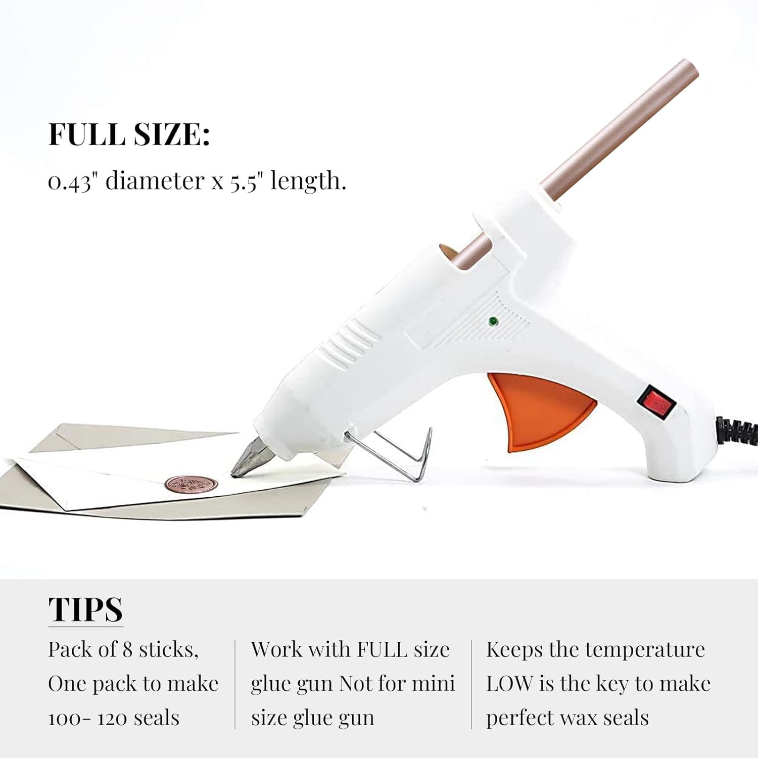 - EASY TO APPLY - Easily use together with a low-temp large standard 0.44" glue gun. Not designed for mini glue guns! If you plan to seal dozens of envelops, this is the most efficient method. To avoid the wax stuck to the stamp, you may put stamp on an ice pack in between every 4-5 impressions. Please remember the glue gun was designed for glue stick which requires a much higer melting temperature than the wax, so to keep the temperature low is the key.