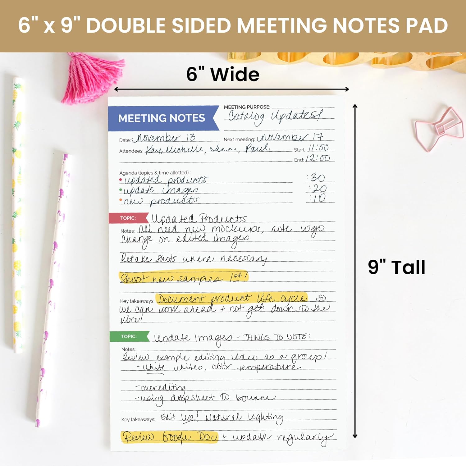 - 6” x 9” MEETING PLANNER TO DO PAD: Measuring 6" wide x 9" tall, this professional notepad for work is compact enough to carry anywhere while offering ample writing space. Perfect for busy professionals, project managers, students, and anyone looking to boost their office productivity.