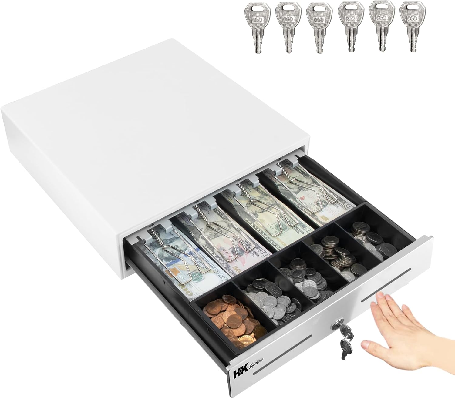 HK SYSTEMS 13inch Heavy Duty Manual Push-Open Cash Drawer with 4Bill/5Coin, Removable Till, "Stainless Steel Front" with Single Large Media Slot,White
