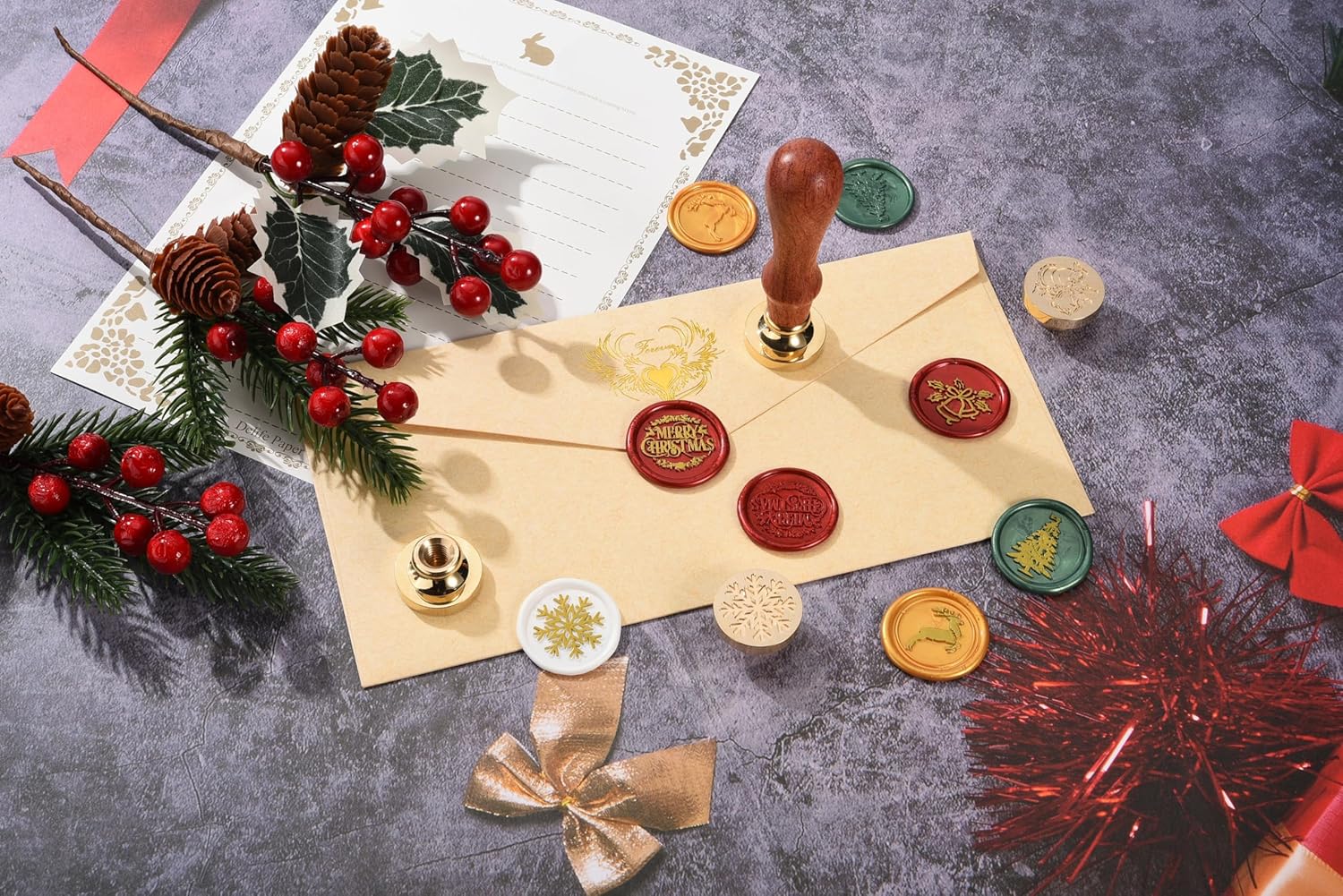Yoption 6 Pcs Wax Seal Stamp Set, Vintage Christmas Sealing Wax Stamps Kit, Wooden Handle with Brass Head for Christmas Invitation Gift Cards