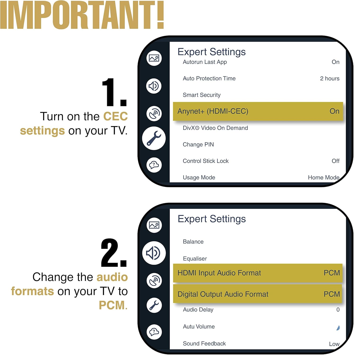 - HD Audio Return Channel FUNCTION: Please check the pictures for CEC/PCM setting guidance. Please help make sure to enable your TV’s CEC and choose PCM as audio format under expert setting on the TV. The HD Audio Return Channel on the SWM15-PROS karaoke mixer allows you to extract the audio from the TV to the mixer. This allows the mixer to blend the music and vocal, and send the mixed signals to a soundbar or amplifier (HDMI cable is not included)