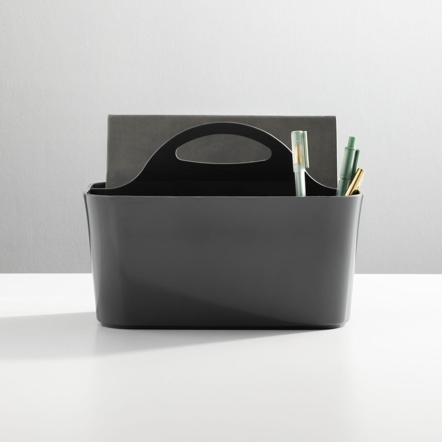 mDesign Plastic Small Office Storage Organizer Utility Tote Caddy with Handle for Cabinets, Desks, Workspaces - Hold Desktop Office Supplies, Pencils, Staplers Lumiere Collection, 2 Pack, Dark Gray