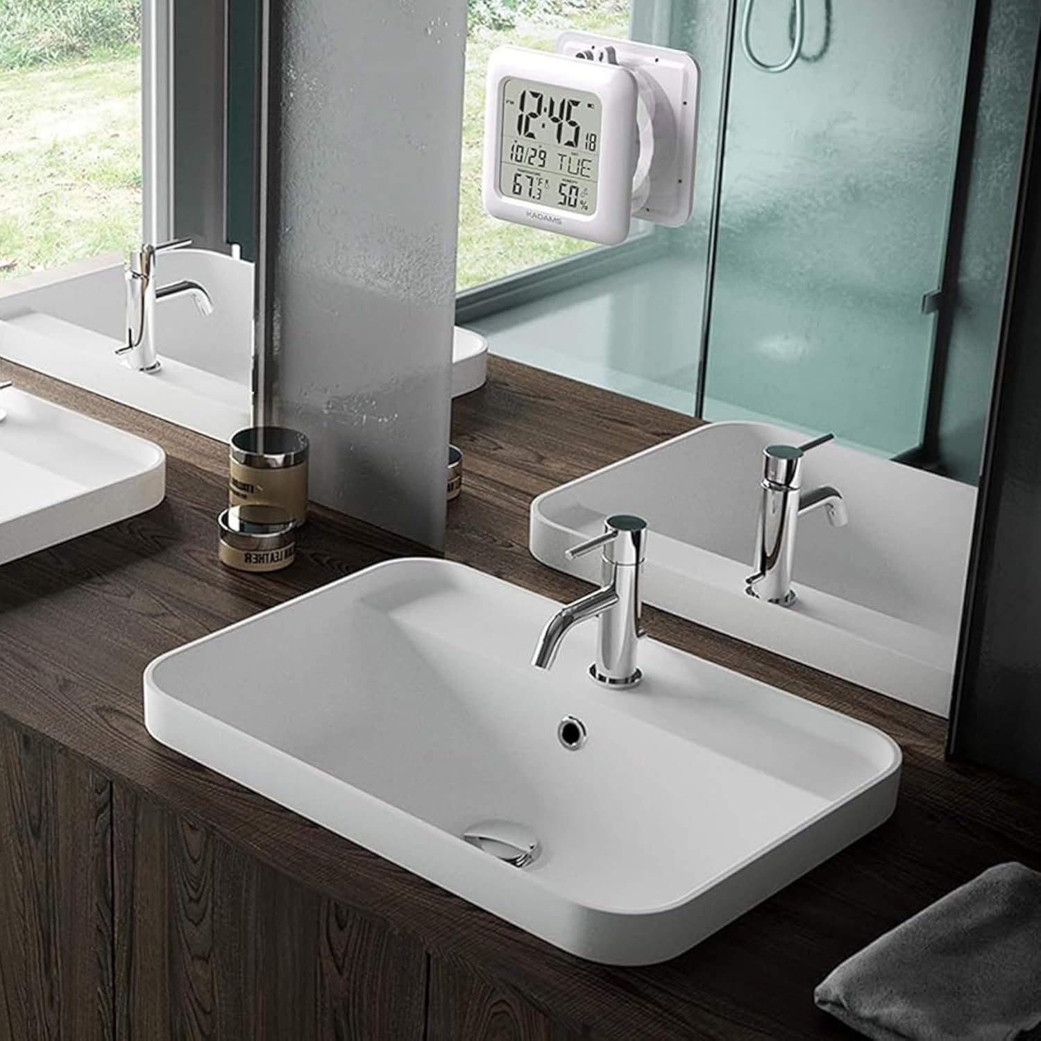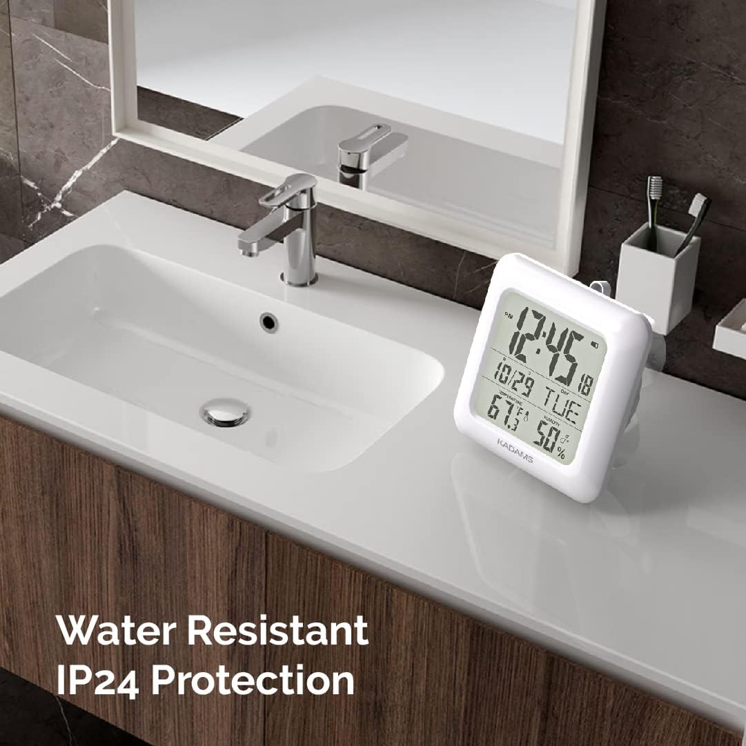 KADAMS Bathroom Clock 9.5" Kitchen Wall Clock with Large LCD Screen – Shower Clock with Suction Cup,Temperature, Humidity, Calendar – Water-Resistant, 4 Mounting Options, White