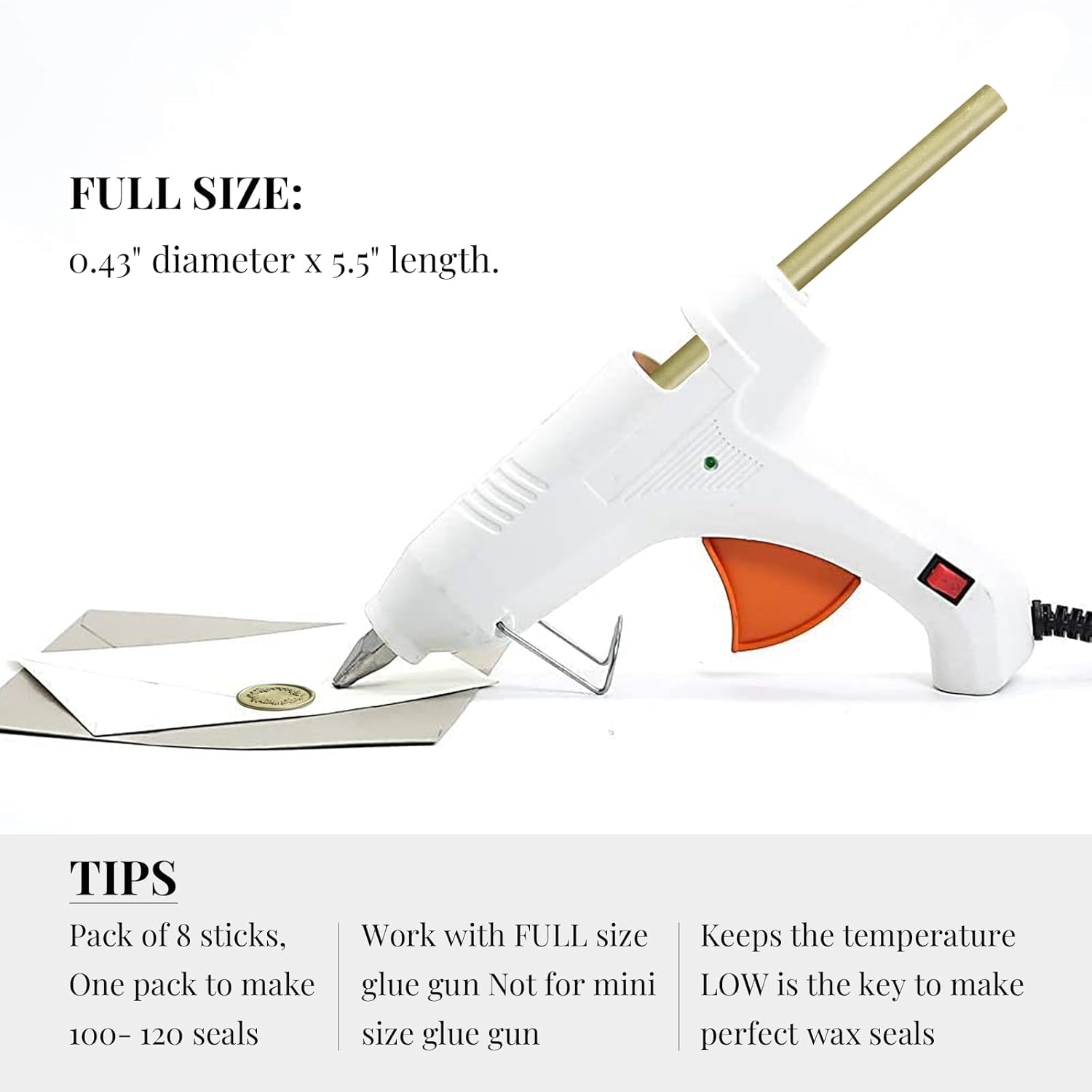 - Easy To Apply - Easily use together with a low-temp large standard 0.44" glue gun. Not designed for mini glue guns! If you plan to seal dozens of envelops, this is the most efficient method. To avoid the wax stuck to the stamp, you may put stamp on an ice pack in between every 4-5 impressions. Please remember the glue gun was designed for glue stick which requires a much higer melting temperature than the wax, so to keep the temperature low is the key.