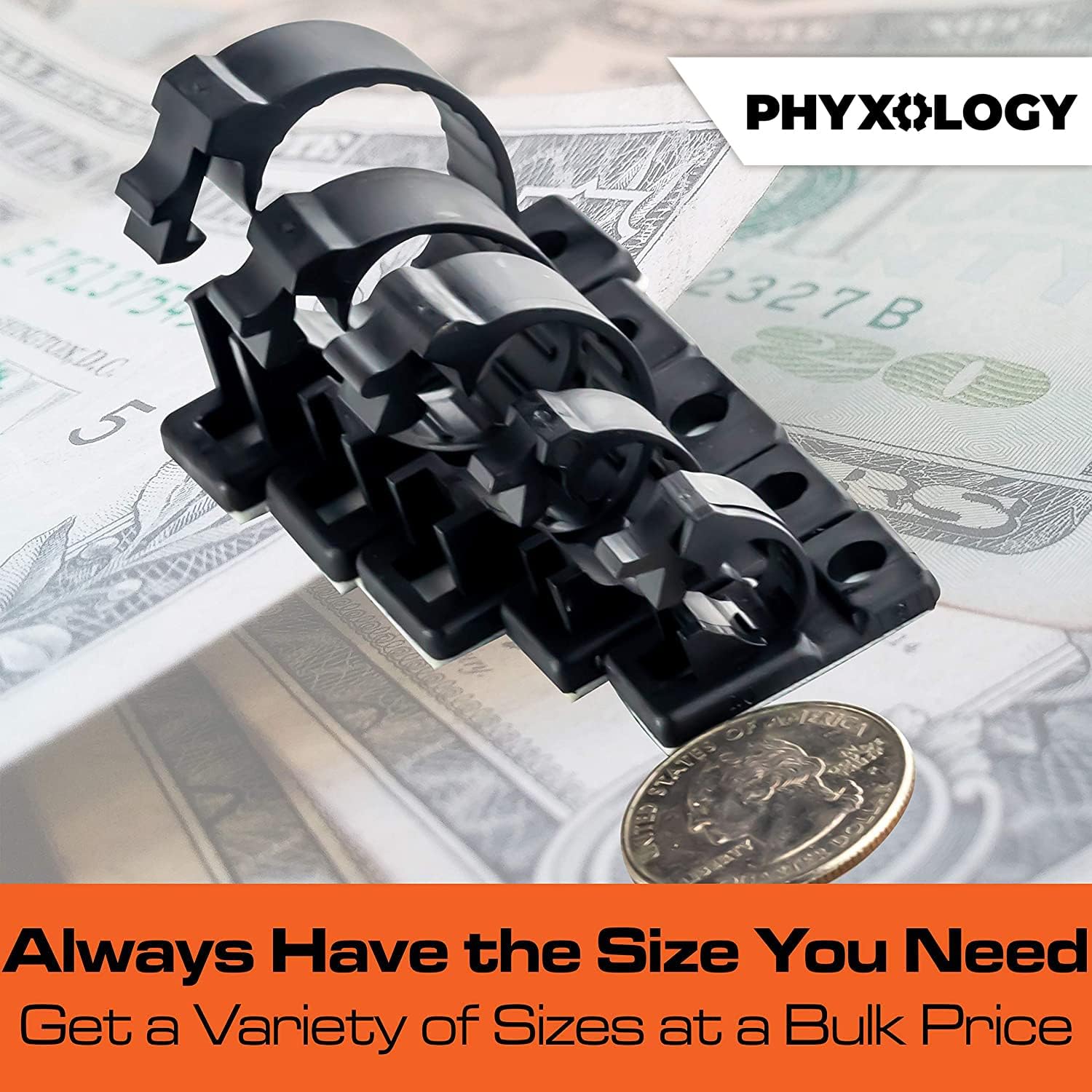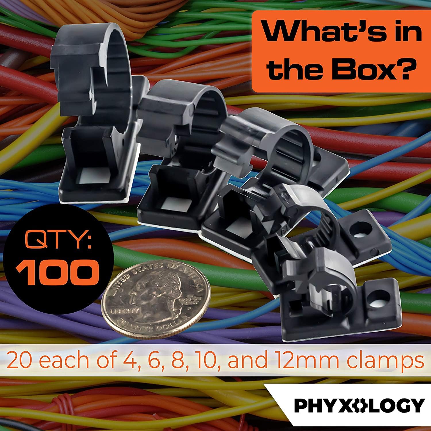 Pro-Grade, Adhesive-Backed Cable Clamps. Multi-Size Set of 20x 4, 6, 8, 10 and 12 mm Black Clips - Wire Management, Cord Organization - Home and Office Tools-Free Install (100 Pk)