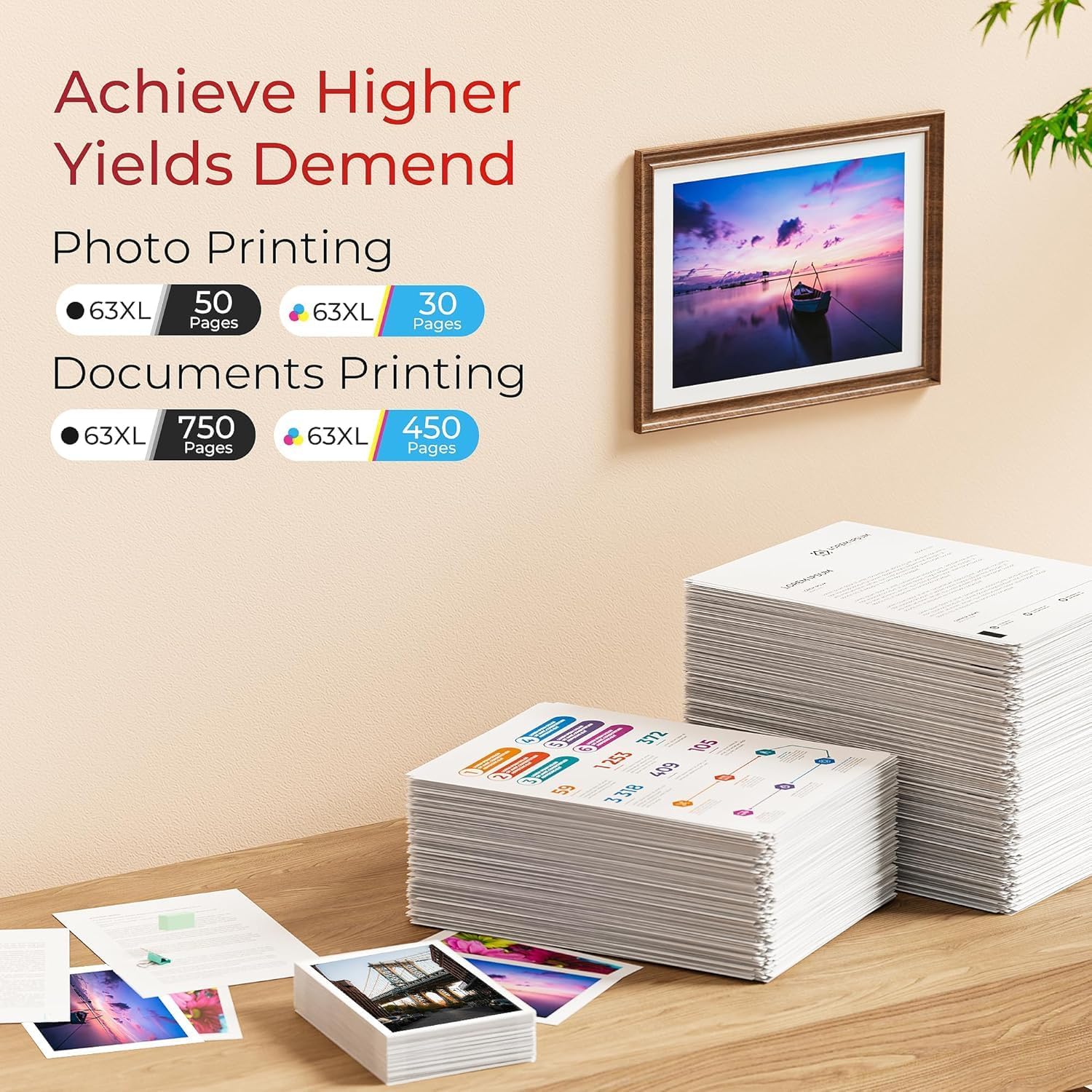 - High Page Yield: 711 pages for 63XL black ink cartridge and 450 pages for 63XL color ink cartridge at 5% coverage