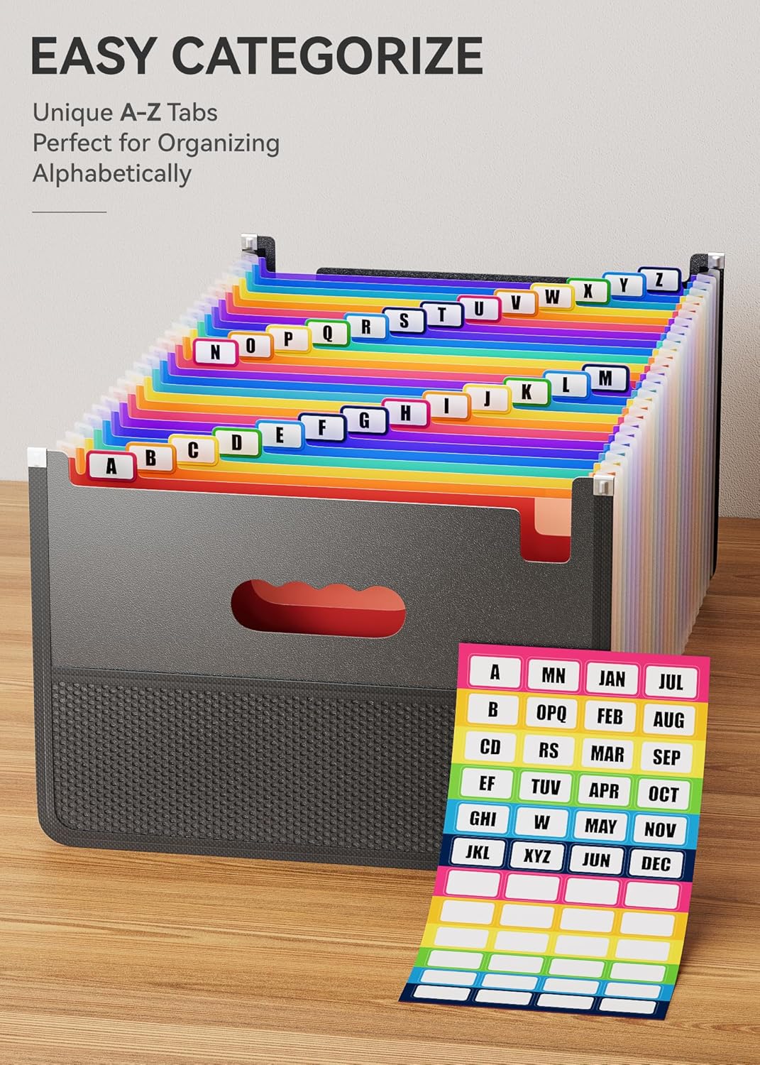 - ✅【26 POCKETS MONTHLY FILE ORGANIZER】ABC life 26 pockets Accordian File Organizer suitable for filing tax and storing important family documents. Product size is 13 "x 9.4"x 28", which can be used to store plenty of Letter/A4 size files.