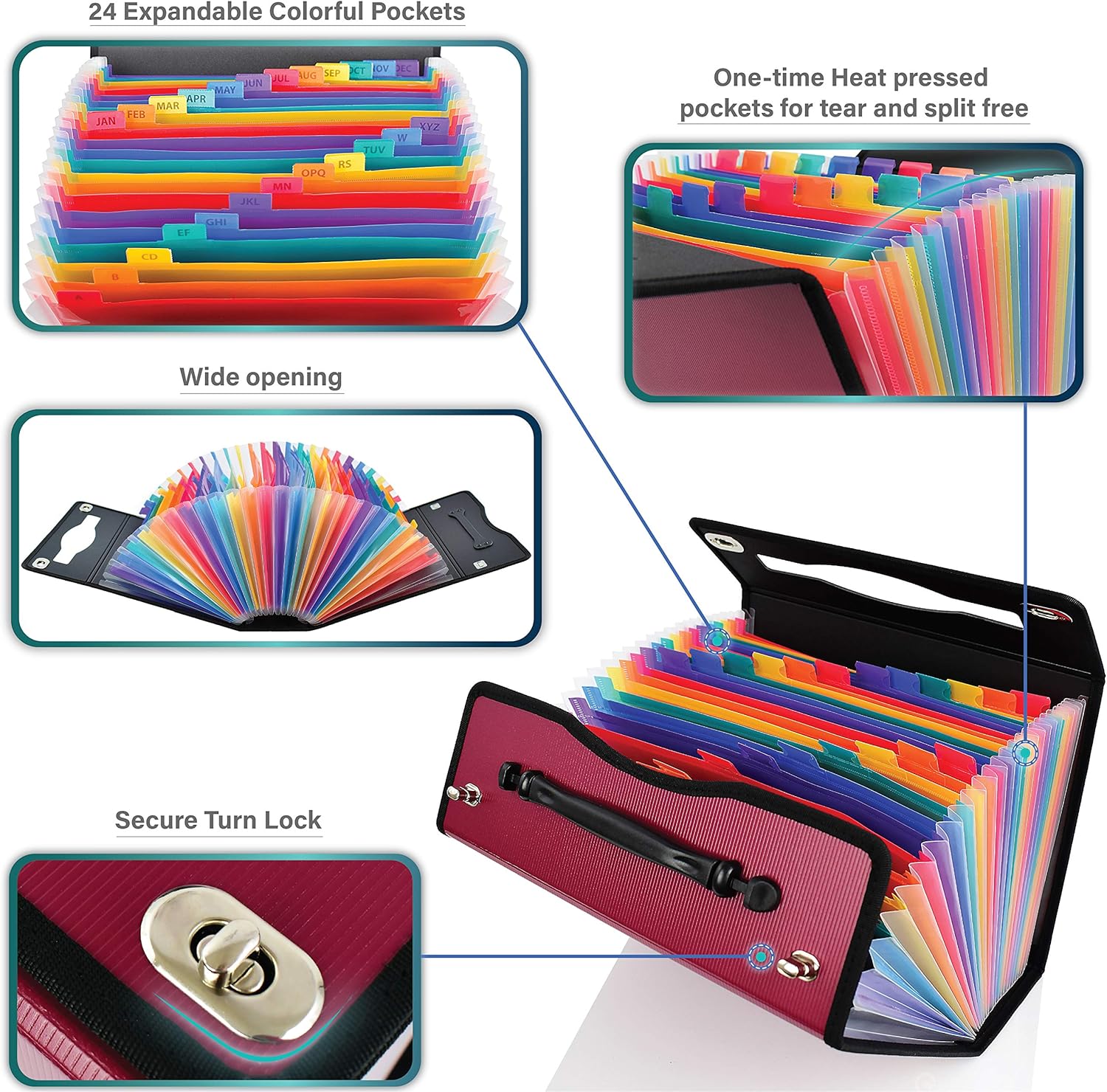 - 24 Individual Pockets with Colorful stylish design are tabbed to allow for adding handwritten labels, ensuring each section can be instantly identified for quick access.