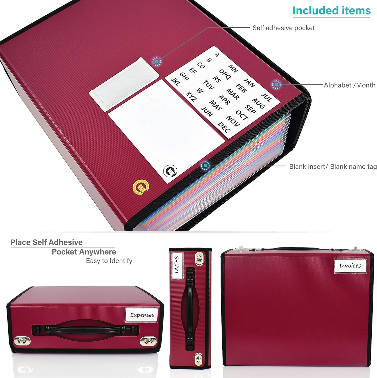- The Self Adhesive Pockets is included to easily mark and categorize multiple organizers along with Alphabet, Month, Black Tags for your needs! The Month and Alphabet Printed Tags are big and bold to easily see and efficiently designed for easy insertion and removal