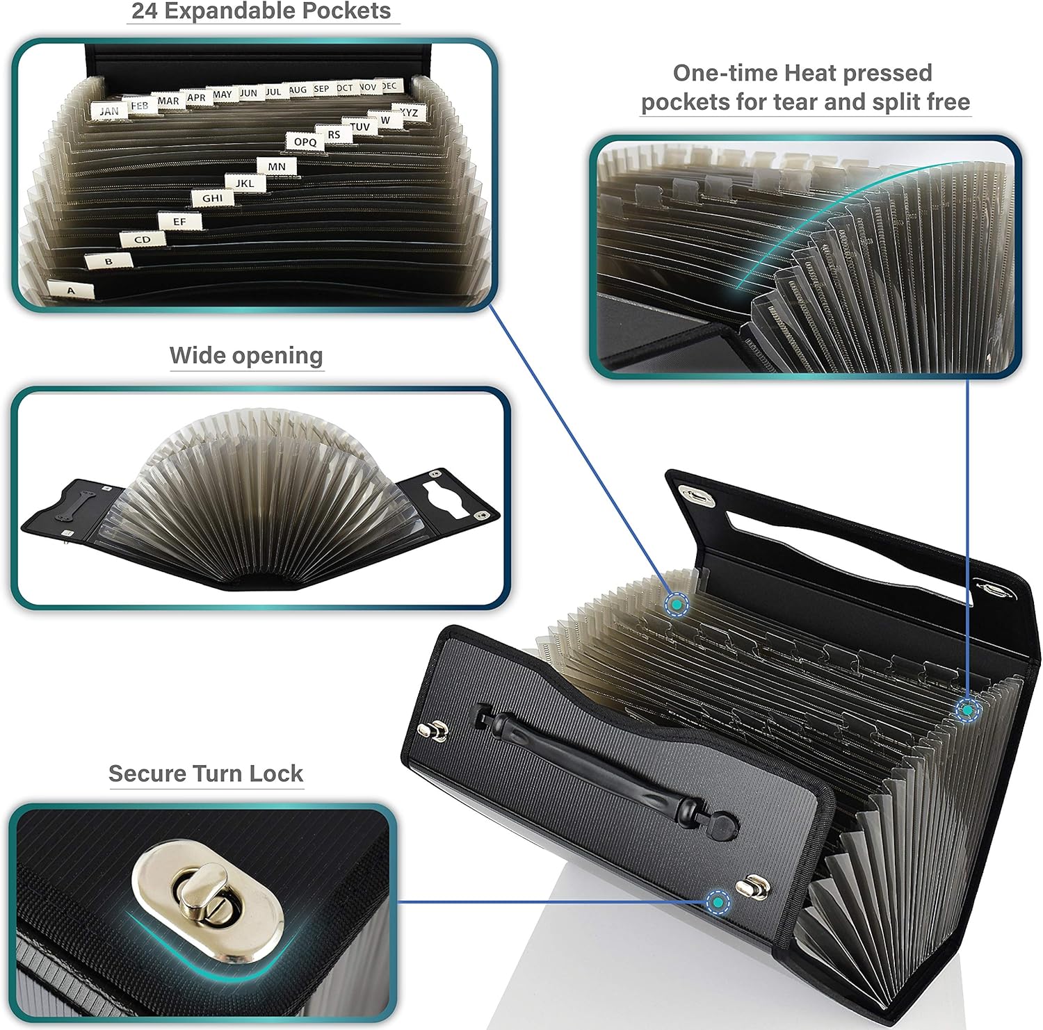 - 24 Individual Pockets with Colorful stylish design are tabbed to allow for adding handwritten labels, ensuring each section can be instantly identified for quick access.
