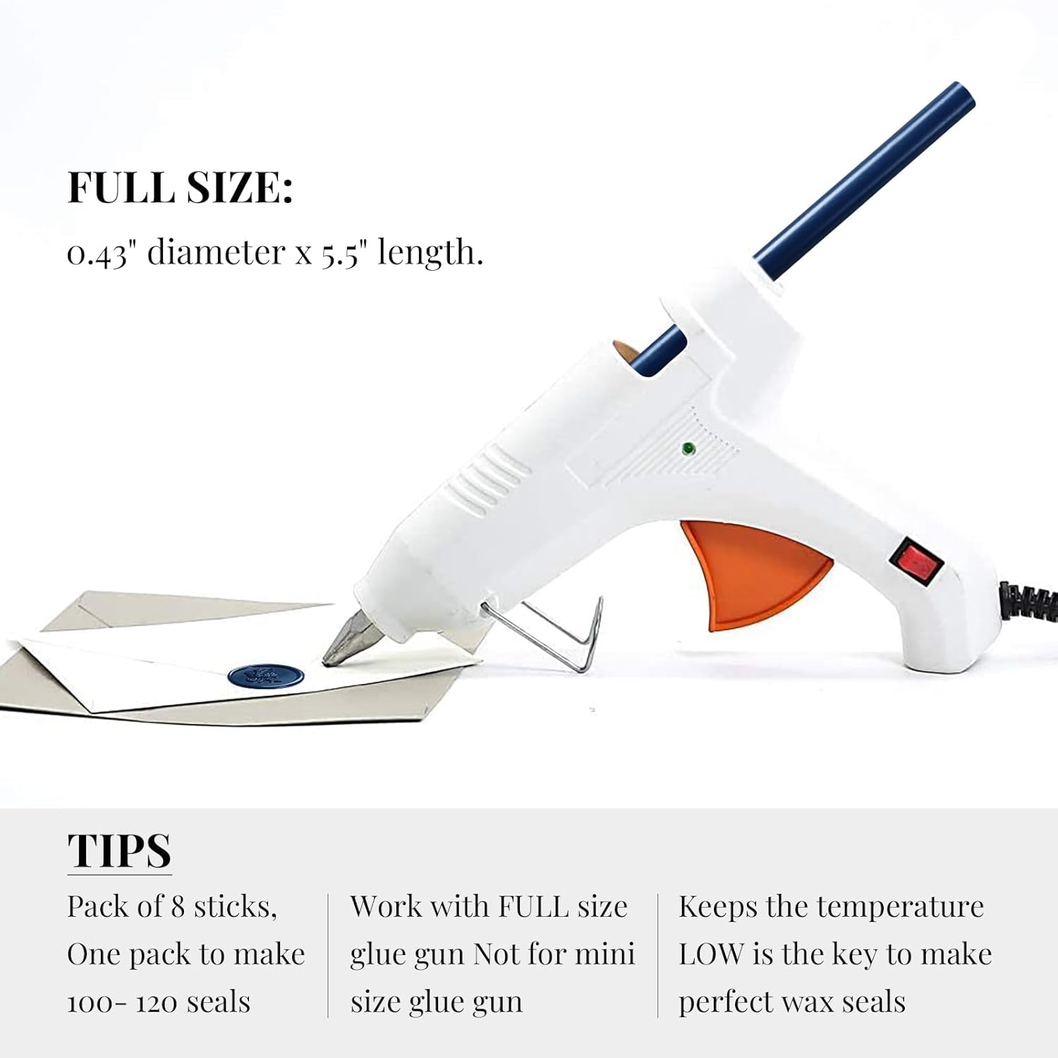 - Easy To Apply - Easily use together with a low-temp large standard 0.44" glue gun. Not designed for mini glue guns! If you plan to seal dozens of envelops, this is the most efficient method. To avoid the wax stuck to the stamp, you may put stamp on an ice pack in between every 4-5 impressions. Please remember the glue gun was designed for glue stick which requires a much higer melting temperature than the wax, so to keep the temperature low is the key.