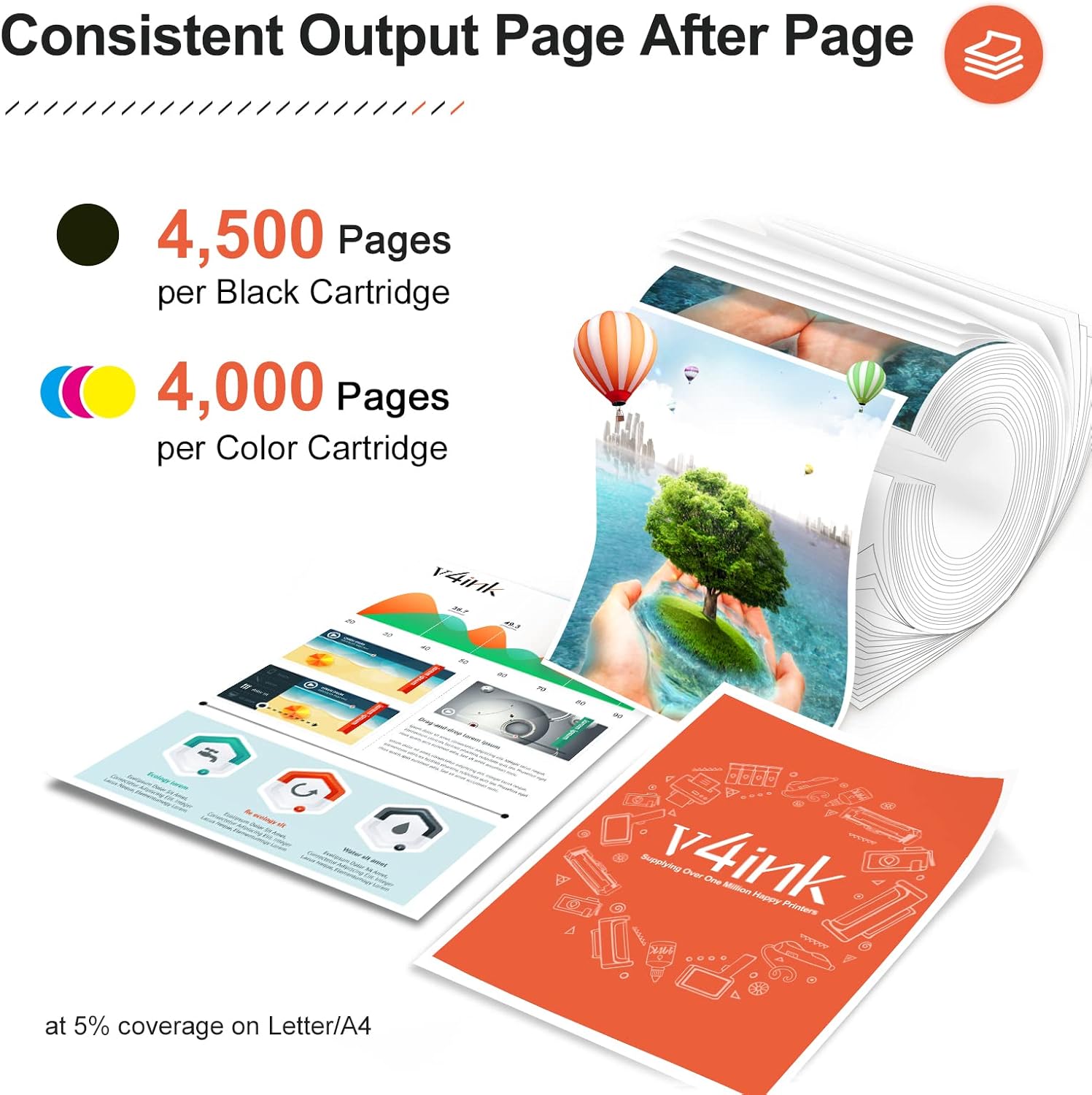 - Print more and cost less: 4,500 Pages per Black cartridge, 4,000 Pages per Cyan/Yellow/Magenta Cartridge at 5% coverage (Letter/A4)