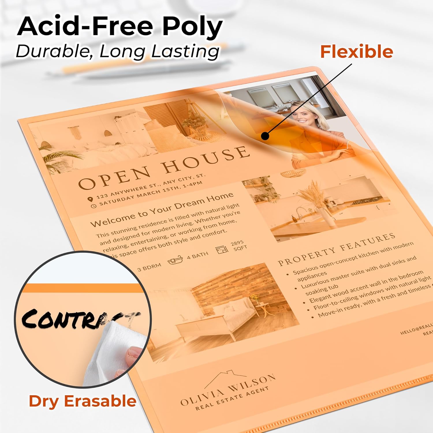 - Premium Quality: Heavy duty plastic sleeves. Acid-free, PVC-free. Archival quality write-on vinyl plastic clear folders are dry erasable, easy to clean. No ink lift-off or copy transfer.