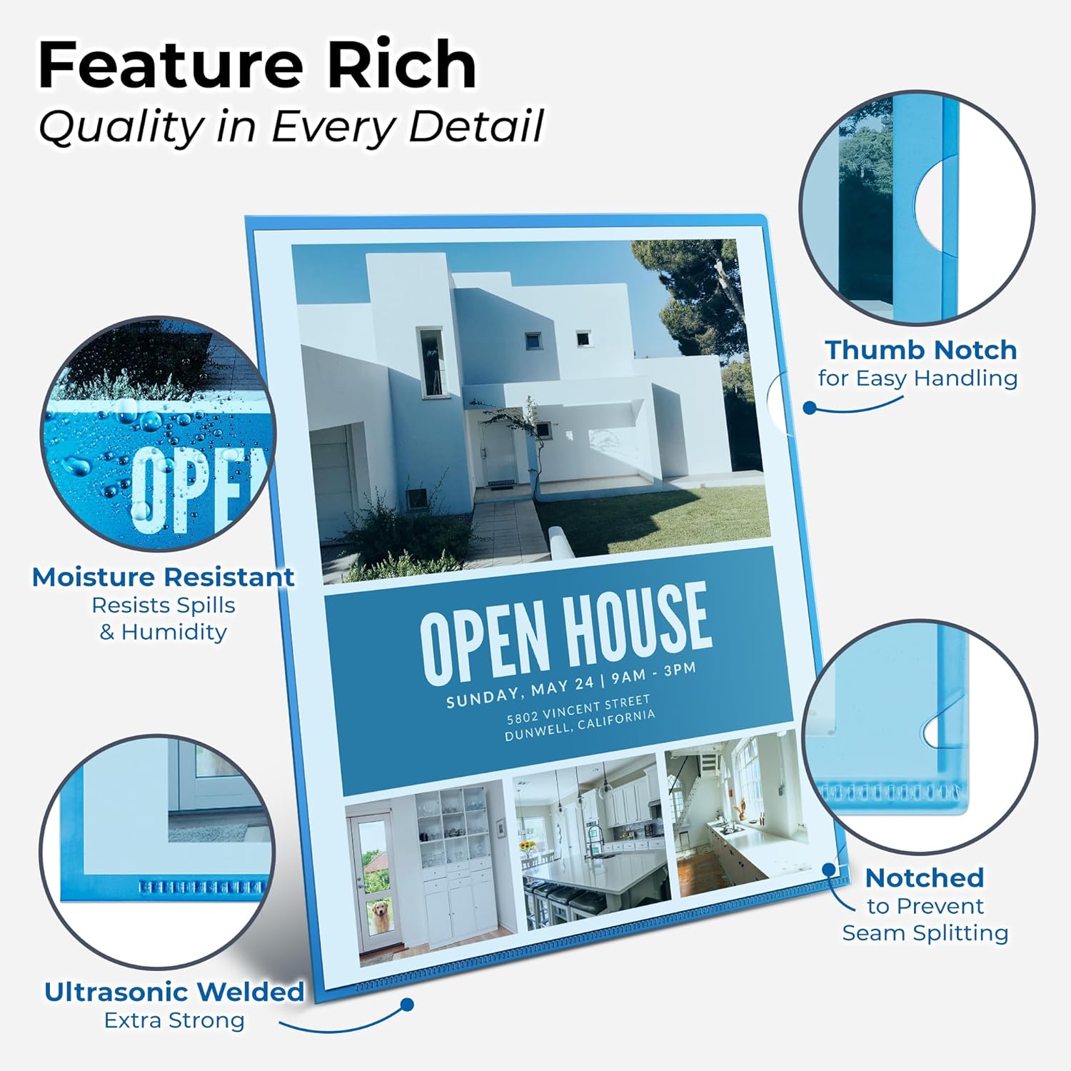 - Standard Plastic File Folders: L-type 8.5x11 clear plastic sleeves. Letter size (Not A4). Top and side-loading with thumb notch for easy access. Poly see through project folders with clear cover.