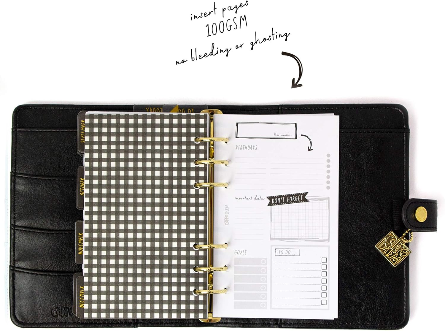 - Personal Planner: Seize the Day with Carpe Diem's stylish, faux leather personal planner; undated for your convenience so you can start planning any time of the year; premium, heavy-weight, designer inserts offer the ability to write, plan, organize and journal with no ghosting or bleed through