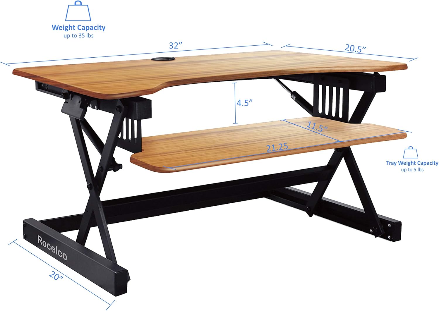 Rocelco 32" Height Adjustable Standing Desk Converter - Sit Stand Computer Workstation Riser - Dual Monitor Retractable Keyboard Tray Gas Spring Assist - Teak Wood Grain (R EADRT)