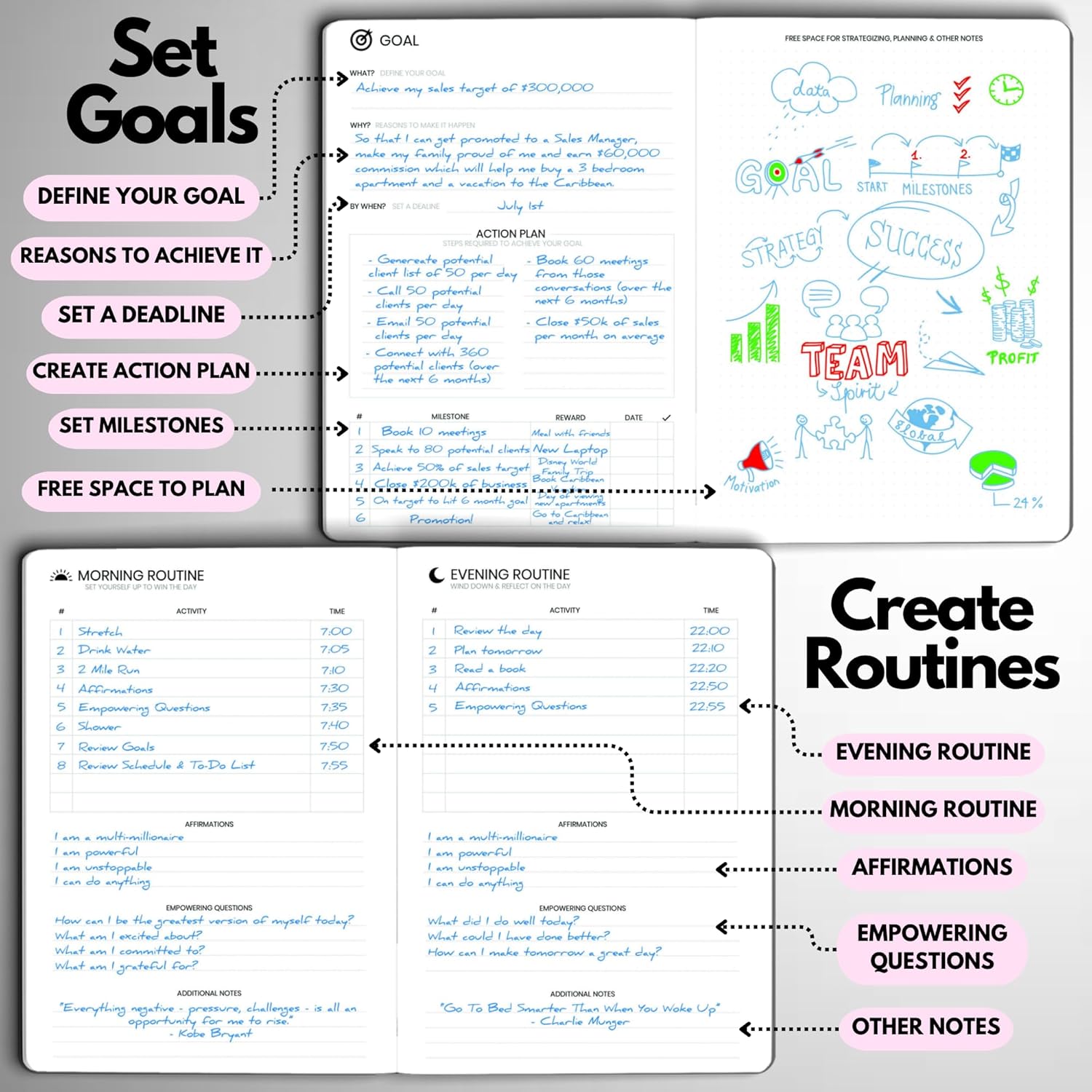 - STAY ALIGNED WITH YOUR GOALS – Use built-in goal-setting tools and review prompts to stay focused on long-term success—whether you’re managing business milestones, career growth, or personal development.