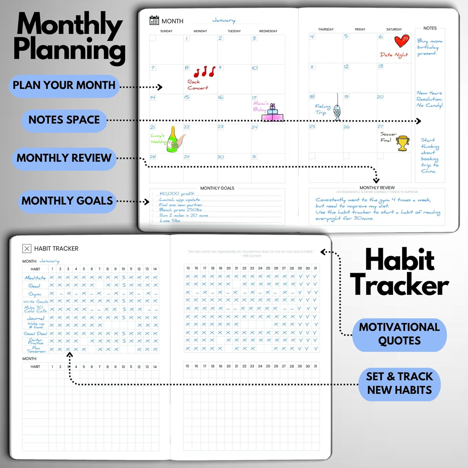 - STAY ALIGNED WITH YOUR GOALS – Use built-in goal-setting tools and review prompts to stay focused on long-term success—whether you’re managing business milestones, career growth, or personal development.