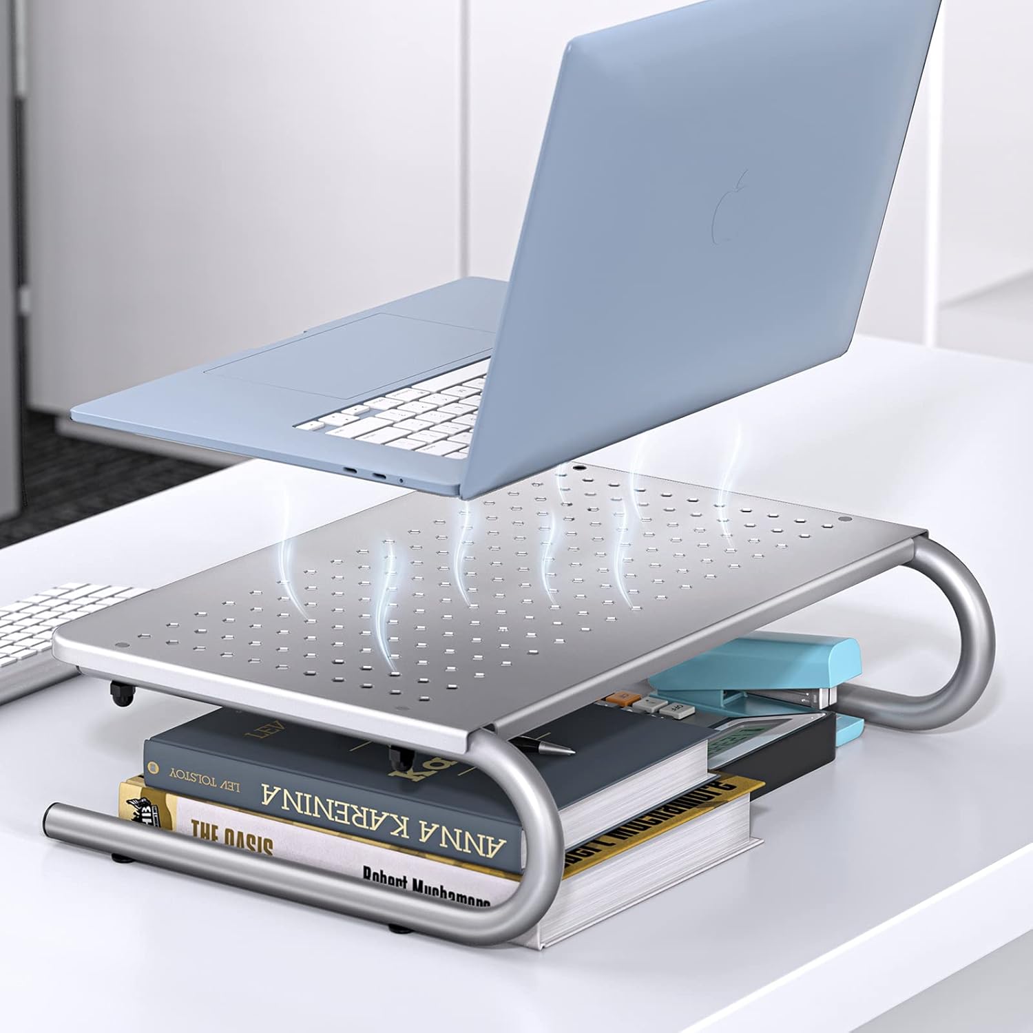 - MONITOR STAND WITH HOLE DESIGN: Made of power coated steel with perforated holes, this laptop ventilation stand performs well for air flow and keeps your laptops/printers cool.