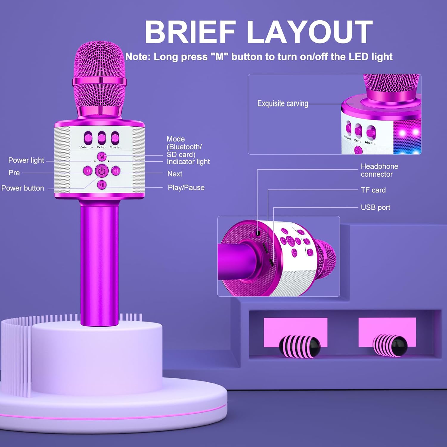 - 【Controllable Dynamic LED Light】— Music~ 27 colorful LED lights will flicker with the rhythm of the music. Higher volume, brighter light, perfectly creating a karaoke atmosphere for you. If long pressing "M", the LED light will appear/ disappear.