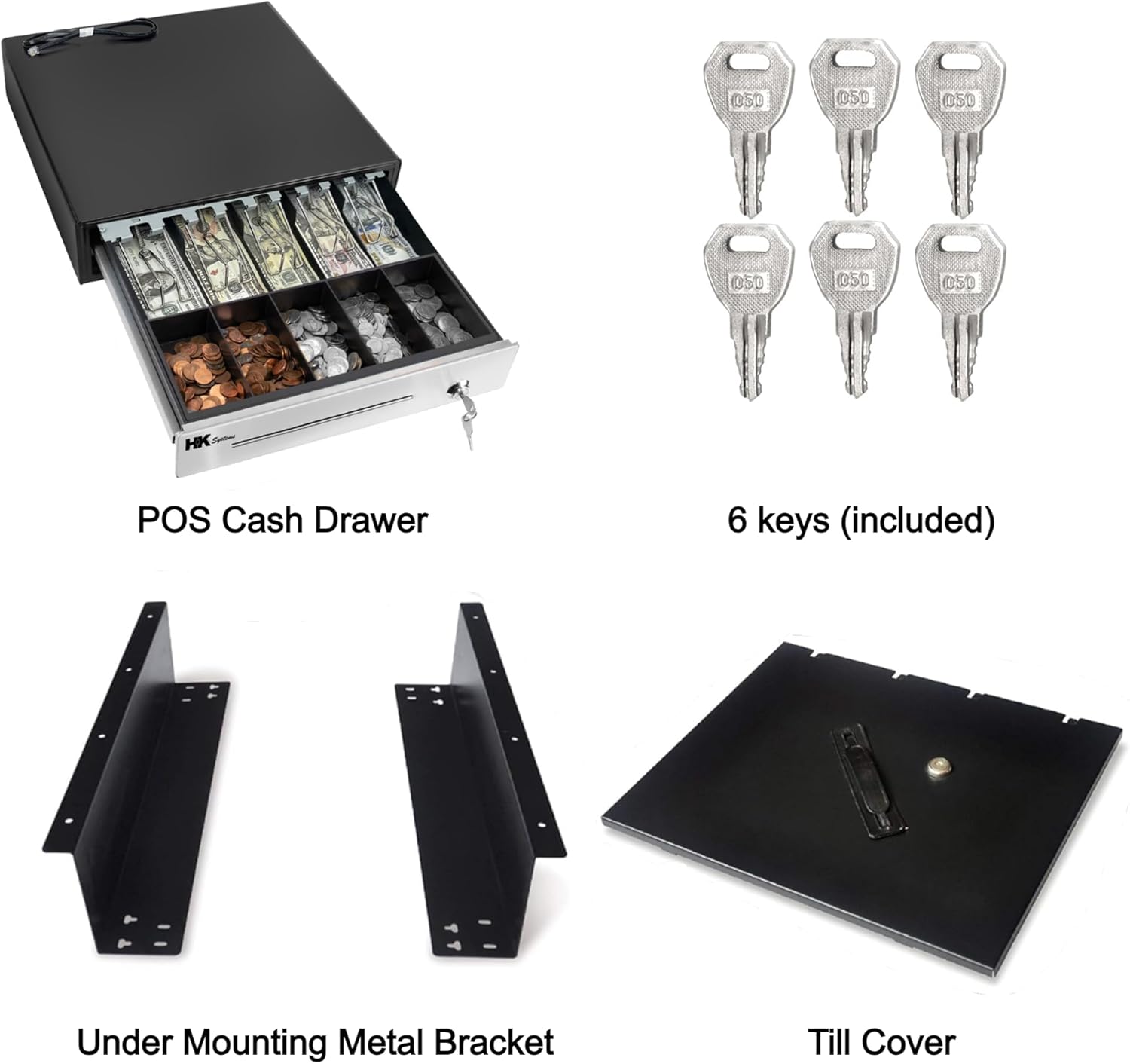 HK SYSTEMS 16""Stainless Steel" Front Heavy Duty Black POS Cash Drawer with 5Bill/5Coin with Under Counter Mounting Metal Bracket and Till Cover