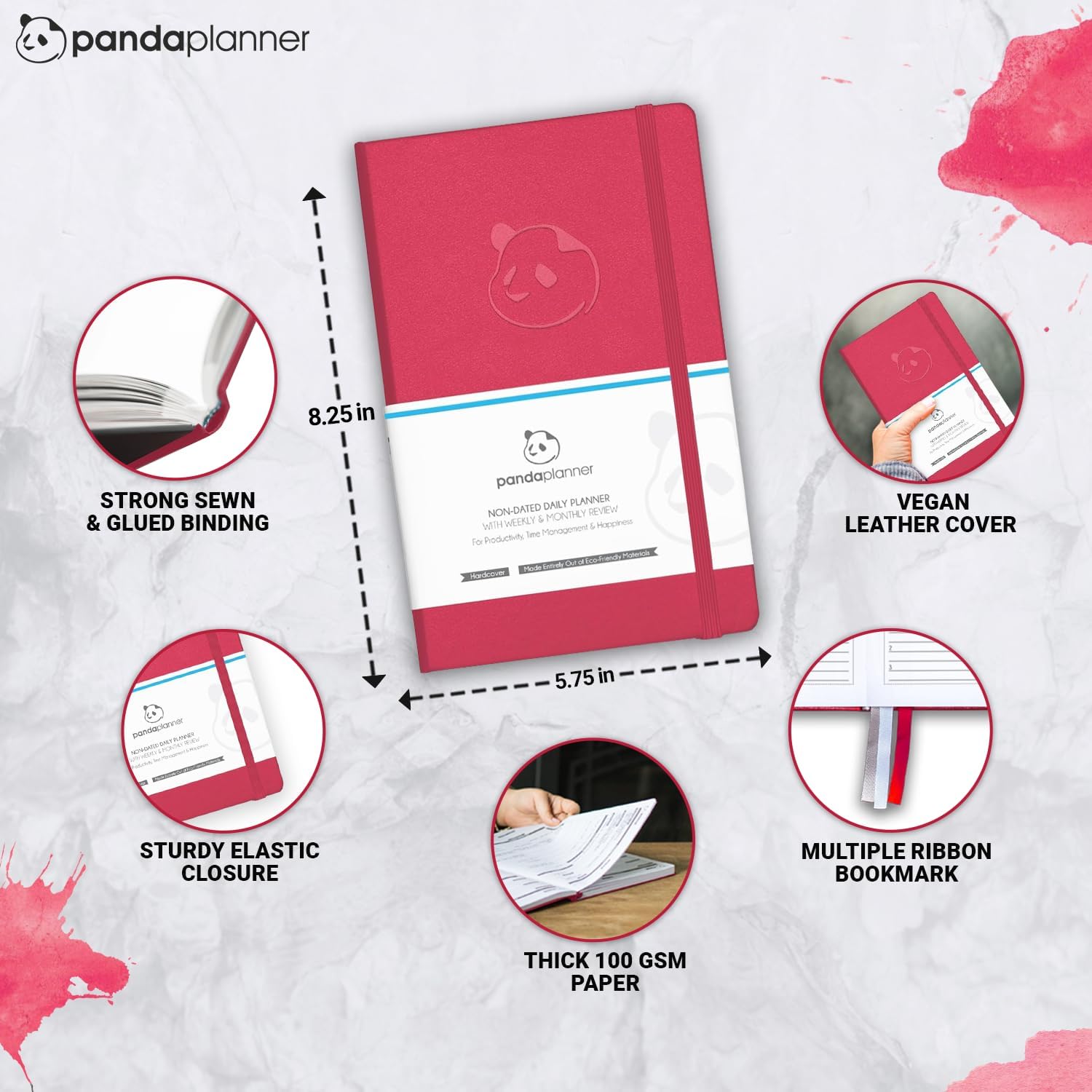 Panda Planner Classic Daily Planner 2025-2026 – Undated Productivity Planner & Hourly Schedule Notebook – Day Planner for Focus, Goals & Organization – Raspberry