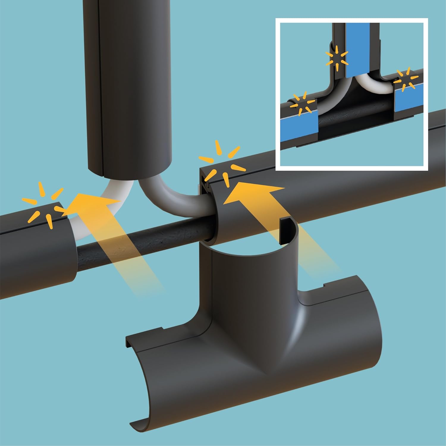 - Bends and Tees have rear grip tabs for simple clip-over fitting enabling easy installations and forgiving any imprecise cuts or measurements.