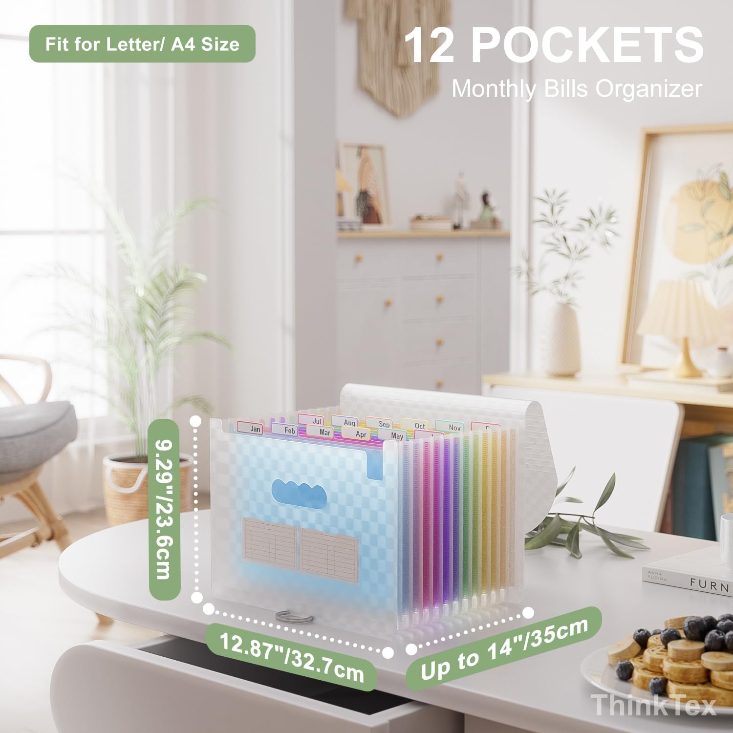 - MONTHLY BILLS ORGANIZER - ThinkTex Portable accordion file organizer, top and bottom both expandable, 12 pockets and multi-colored tabs, for letter/A4 size