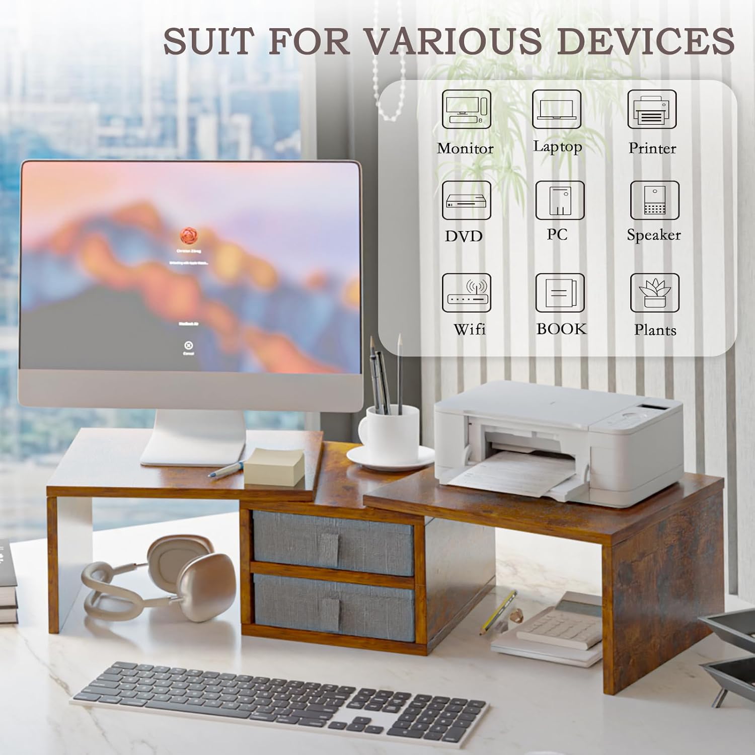 TEAMIX Dual Monitor Stand Riser with 2 Drawers - Length and Angle Adjustable 3 Shelf Monitor Riser with Storage Desk Organizer Large Monitor Stand for 2 Monitors/Laptop/PC,Screen/TV Stand Riser