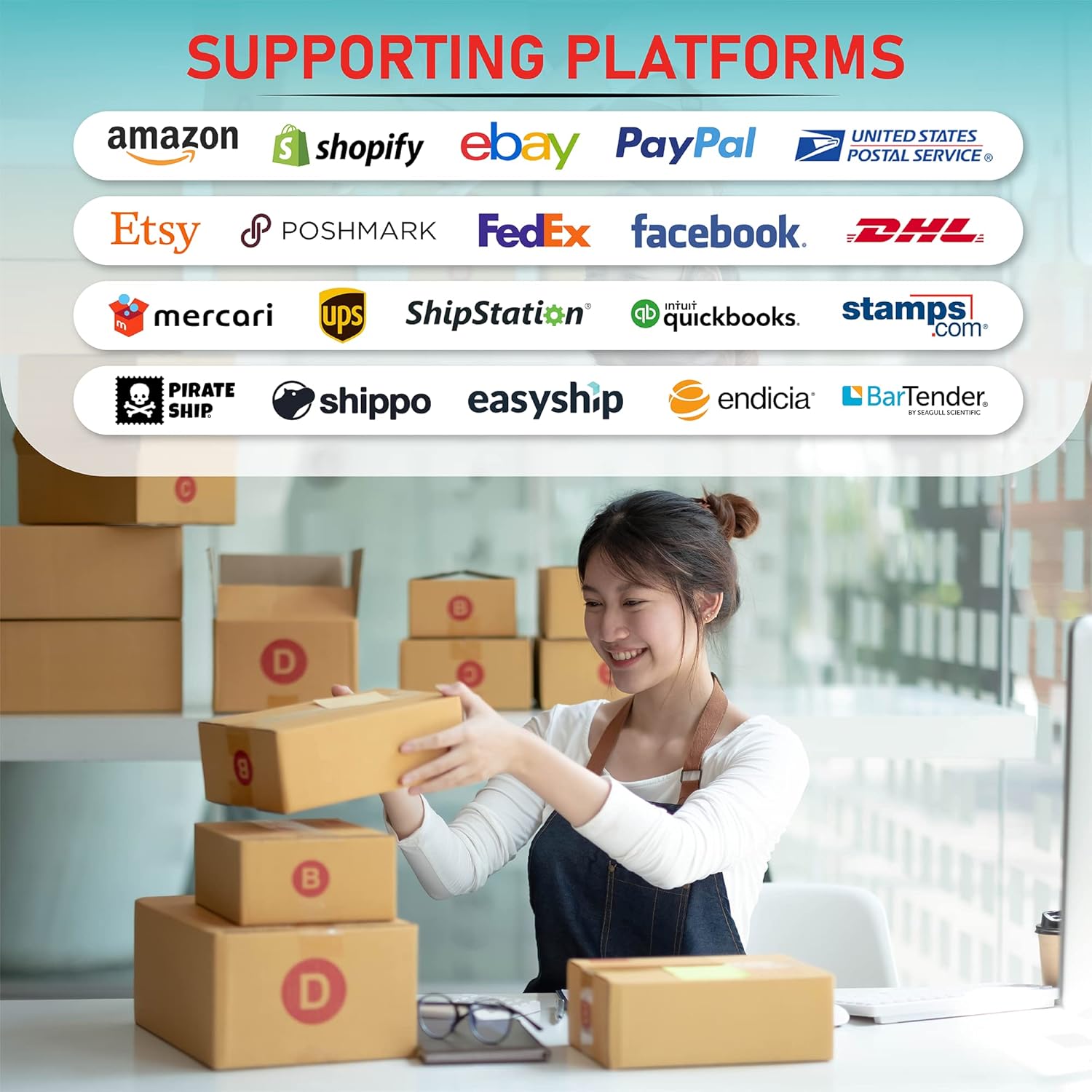 - Print shipping labels for Amz Seller Merchant Fulfillment, FBA, FNSKU, EasyPost, EasyShip, eBay, Endicia Dazzle, Etsy, Fedex Ship Manager, Fedex website, Inventory Lab, PayPal, Poshmark, ShippingEasy, Shippo, ShipStation, ShipWire, ShipWorks, ShopGator, Shopify, Stamps Desktop, Stamps website, StockX, UPS WorldShip Desktop, UPS website, USPS website, XPSship, Endicia Dazzle, Pirateship and more.