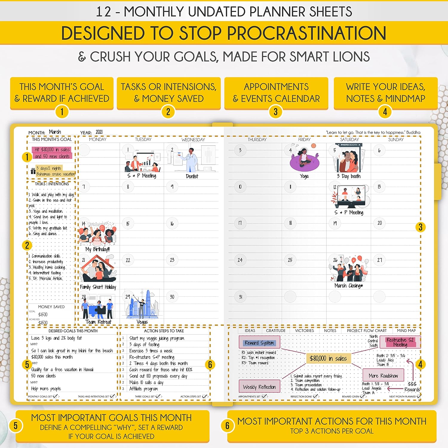 - UNDATED PLANNER - All the tools for success you need to create the life you've always wanted. This planner measures A5 (6 x 8.5 inches) and boasts thick 100 gsm paper. It features a Horizontal Planner layout, offering 212 pages for life transformation, including 53 weekly spreads, 12 monthly planning overviews with reflection sections, 22 dotted journal pages, habit trackers, mind maps, morning and evening routines, inner pockets, pen holder, and comes in a gift box. This life planner is undated, serving as a daily, weekly, and monthly planner, giving you the freedom to start your journey whenever it suits you best.