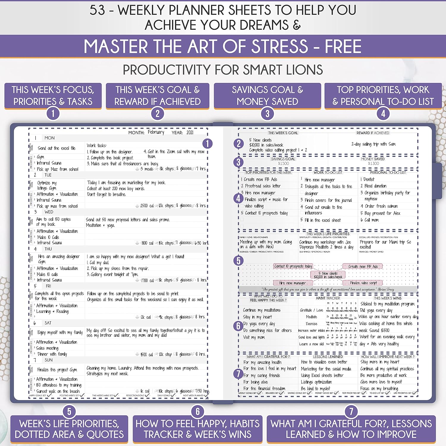 - LIFE PLANNER - A5 Size, 212 pages of life transformation, 53 weekly, 12 monthly planning overviews & reflection, 22 dotted journal pages, habit trackers, mind maps, morning & evening routines, inner pockets, pen holder & gift box