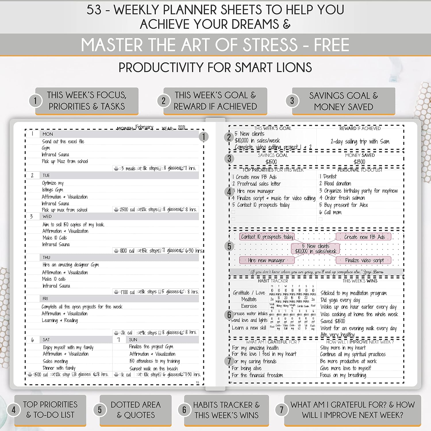 - UNDATED PLANNER - All the tools for success you need to create the life you've always wanted. This planner measures A5 (6 x 8.5 inches) and boasts thick 100 gsm paper. It features a Horizontal Planner layout, offering 212 pages for life transformation, including 53 weekly spreads, 12 monthly planning overviews with reflection sections, 22 dotted journal pages, habit trackers, mind maps, morning and evening routines, inner pockets, pen holder, and comes in a gift box. This life planner is undated, serving as a daily, weekly, and monthly planner, giving you the freedom to start your journey whenever it suits you best.