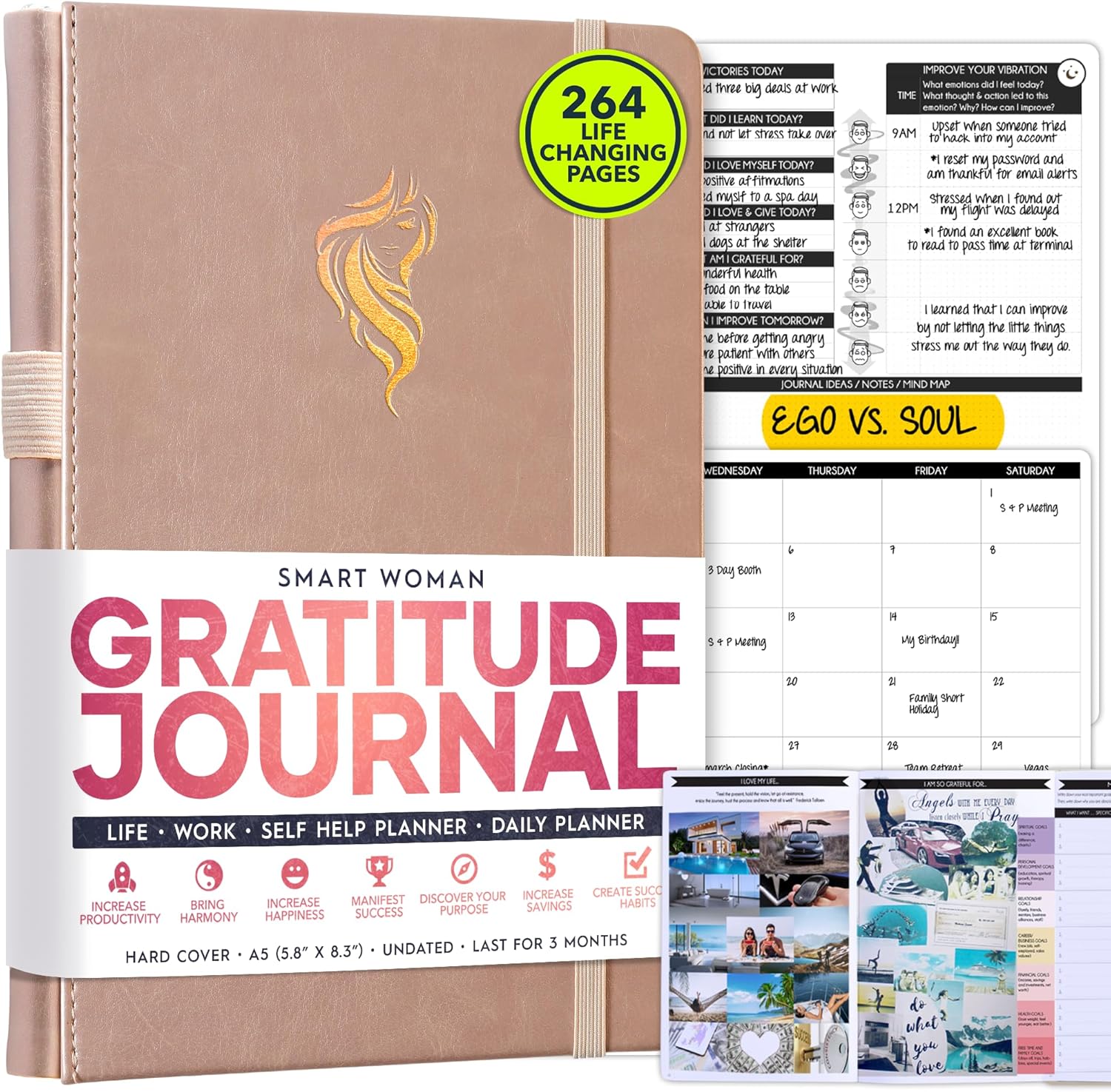 - GRATITUDE JOURNAL - This deluxe daily planner and gratitude journal for women comes in A5 size (5.8 x 8.3 inches). The life planner comprises 264 pages of thick 100 gsm paper, including 90 daily planning sheets, guiding you on how to become the best possible version of yourself on a mental, physical, and interpersonal level. It's a unique diary based on leading scientific studies proven to increase productivity and happiness. The journal features an out-foldable vision board to help you stay focused, morning and evening power questions, mind maps, reflection pages, habit trackers, a back pocket, and much more than any other planner on the market!