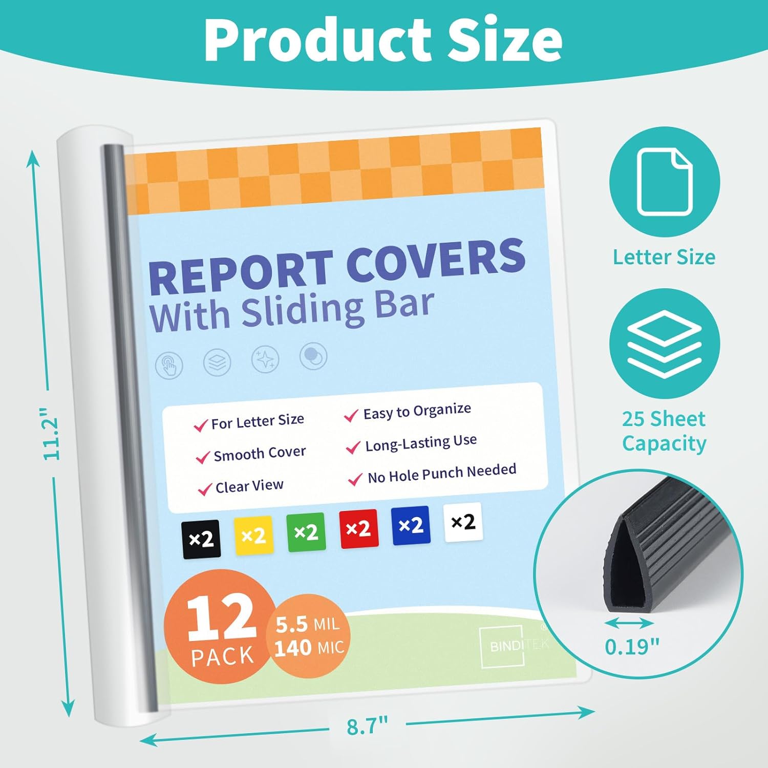 Binditek 12 Pack Clear Report Covers with Sliding Bars, 5mm Sliding Bar File Folder, 25 Sheet Capacity, Letter Size, Multi Color (White, Yellow, Red, Green, Navy, Black), Office Supplies