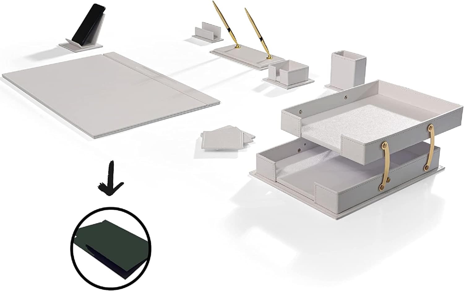 - The bottom of each of our desk accessories and workplace organizers is lined with a protective velveteen backing to ensure the surface of your desk stays scratch and scuff free.